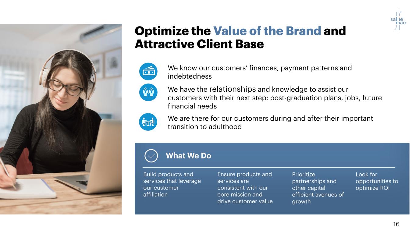 16 Optimize the Value of the Brand and Attractive Client Base What We Do Build products and services that leverage our customer affiliation Ensure products and services are consistent with our core mission and drive customer value We know our customers’ finances, payment patterns and indebtedness We have the relationships and knowledge to assist our customers with their next step: post-graduation plans, jobs, future financial needs We are there for our customers during and after their important transition to adulthood Prioritize partnerships and other capital efficient avenues of growth Look for opportunities to optimize ROI