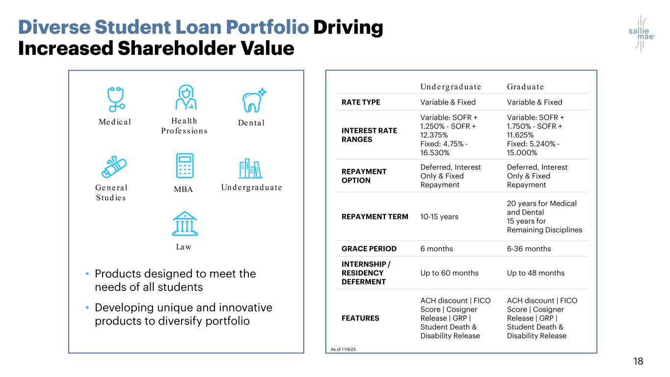 17 Maintain Rigorous Capital Allocation and Return Program Invest in High ROE Growth • Continue to focus on high-quality Private Education Loan originations, including deeper penetration of graduate school market • Build other sources of revenue and capital in expense-efficient ways Quarterly Common Stock Dividend • Paid $0.11 quarterly common stock dividend in Q3 2023 • Expect to continue to pay dividend, subject to Board approval3,15 Share Repurchase • From January 1, 2020, through September 30, 2023, we repurchased 48% of common shares outstanding at January 1, 2020. • $326 million of capacity remained under our 2022 Share Repurchase Program authorization at September 30, 2023 (which expires in Jan. 2024). We allocate capital with discipline Current Hybrid Hold / Sell Loan Model3 • Selling assets to optimize growth in required capital • The expected result is a balance sheet that will remain relatively flat under the current approach despite loan sales, to maximize shareholder return as we phase-in CECL requirements. • $1B in Private Education Loan sales completed on October 13, 2023 – will enable additional return of excess capital to shareholders