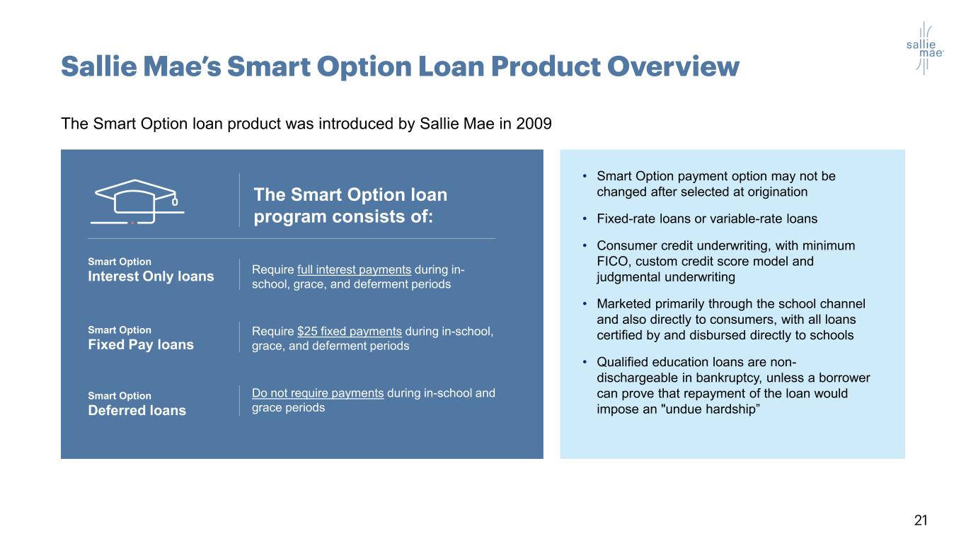 21 Sallie Mae’s Smart Option Loan Product Overview The Smart Option loan product was introduced by Sallie Mae in 2009 The Smart Option loan program consists of: Smart Option Interest Only loans Require full interest payments during in- school, grace, and deferment periods Smart Option Fixed Pay loans Require $25 fixed payments during in-school, grace, and deferment periods Smart Option Deferred loans Do not require payments during in-school and grace periods • Smart Option payment option may not be changed after selected at origination • Fixed-rate loans or variable-rate loans • Consumer credit underwriting, with minimum FICO, custom credit score model and judgmental underwriting • Marketed primarily through the school channel and also directly to consumers, with all loans certified by and disbursed directly to schools • Qualified education loans are non- dischargeable in bankruptcy, unless a borrower can prove that repayment of the loan would impose an "undue hardship”