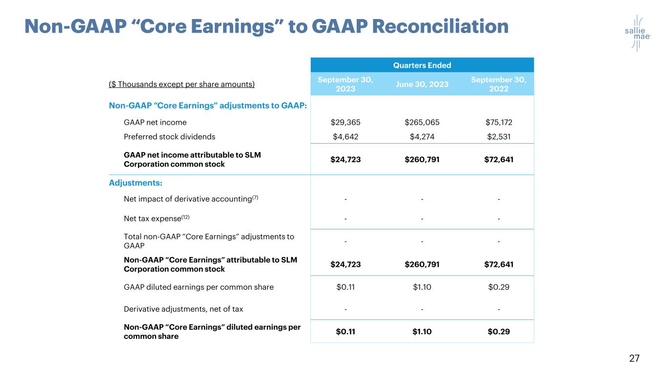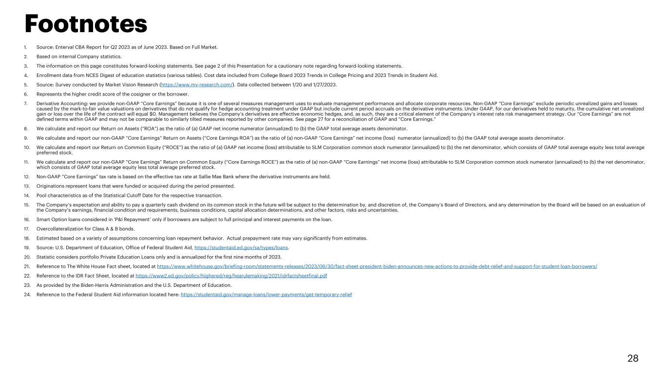 27 Non-GAAP “Core Earnings” to GAAP Reconciliation Quarters Ended ($ Thousands except per share amounts) September 30, 2023 June 30, 2023 September 30, 2022 Non-GAAP “Core Earnings” adjustments to GAAP: GAAP net income $29,365 $265,065 $75,172 Preferred stock dividends $4,642 $4,274 $2,531 GAAP net income attributable to SLM Corporation common stock $24,723 $260,791 $72,641 Adjustments: Net impact of derivative accounting(7) - - - Net tax expense(12) - - - Total non-GAAP “Core Earnings” adjustments to GAAP - - - Non-GAAP “Core Earnings” attributable to SLM Corporation common stock $24,723 $260,791 $72,641 GAAP diluted earnings per common share $0.11 $1.10 $0.29 Derivative adjustments, net of tax - - - Non-GAAP “Core Earnings” diluted earnings per common share $0.11 $1.10 $0.29