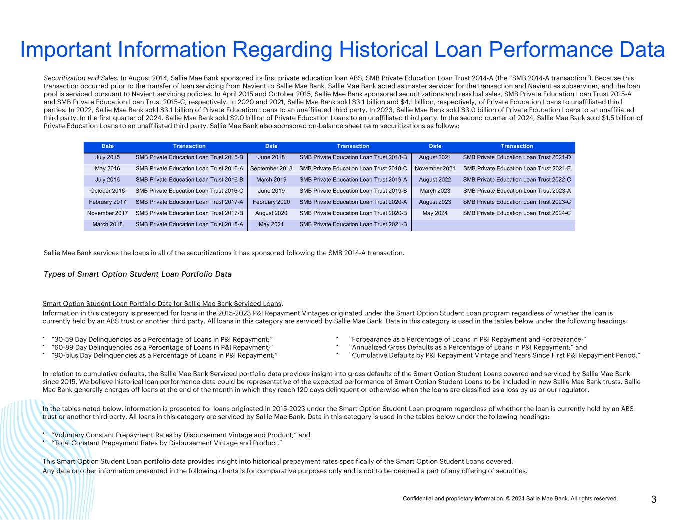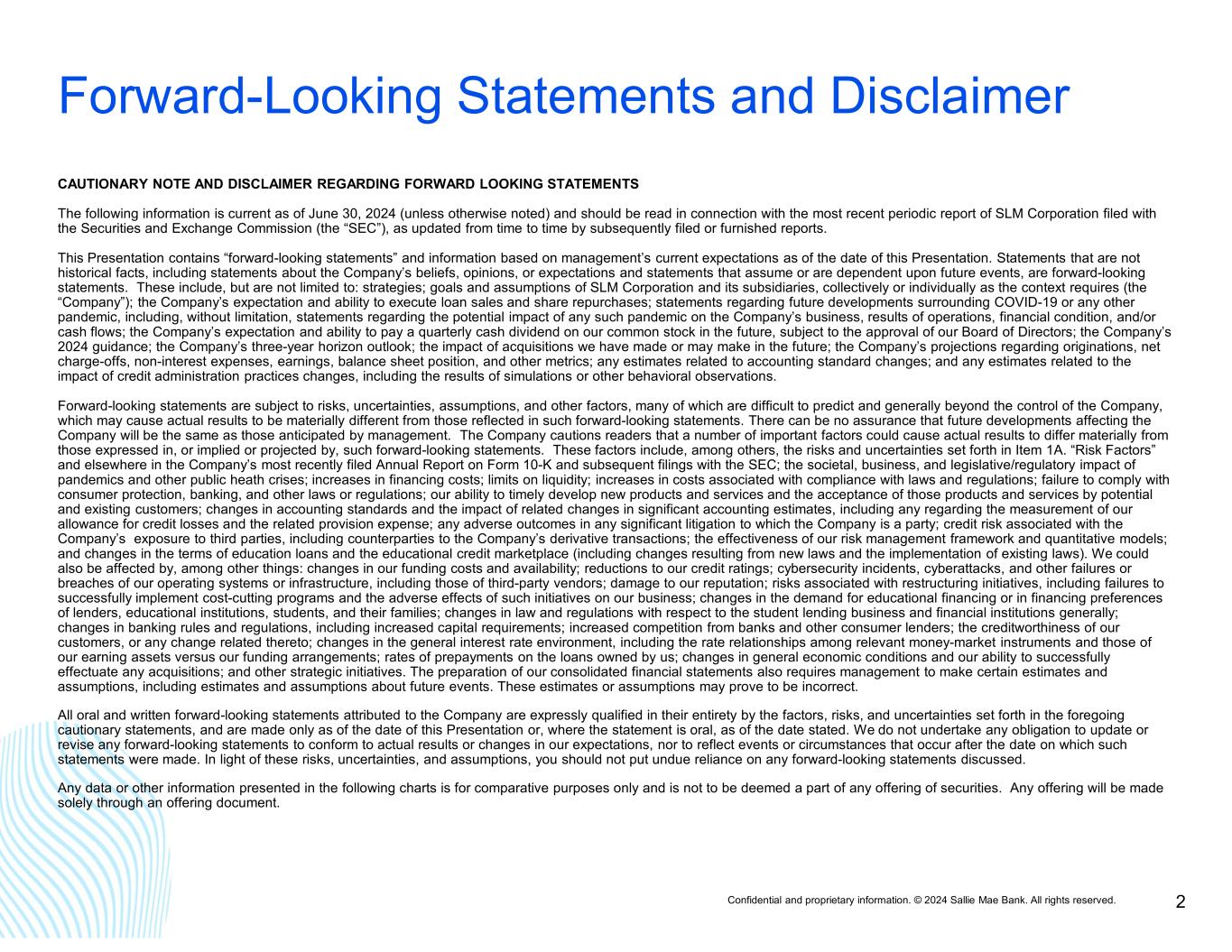 Confidential and proprietary information. © 2024 Sallie Mae Bank. All rights reserved. 2 CAUTIONARY NOTE AND DISCLAIMER REGARDING FORWARD LOOKING STATEMENTS The following information is current as of June 30, 2024 (unless otherwise noted) and should be read in connection with the most recent periodic report of SLM Corporation filed with the Securities and Exchange Commission (the “SEC”), as updated from time to time by subsequently filed or furnished reports. This Presentation contains “forward-looking statements” and information based on management’s current expectations as of the date of this Presentation. Statements that are not historical facts, including statements about the Company’s beliefs, opinions, or expectations and statements that assume or are dependent upon future events, are forward-looking statements. These include, but are not limited to: strategies; goals and assumptions of SLM Corporation and its subsidiaries, collectively or individually as the context requires (the “Company”); the Company’s expectation and ability to execute loan sales and share repurchases; statements regarding future developments surrounding COVID-19 or any other pandemic, including, without limitation, statements regarding the potential impact of any such pandemic on the Company’s business, results of operations, financial condition, and/or cash flows; the Company’s expectation and ability to pay a quarterly cash dividend on our common stock in the future, subject to the approval of our Board of Directors; the Company’s 2024 guidance; the Company’s three-year horizon outlook; the impact of acquisitions we have made or may make in the future; the Company’s projections regarding originations, net charge-offs, non-interest expenses, earnings, balance sheet position, and other metrics; any estimates related to accounting standard changes; and any estimates related to the impact of credit administration practices changes, including the results of simulations or other behavioral observations. Forward-looking statements are subject to risks, uncertainties, assumptions, and other factors, many of which are difficult to predict and generally beyond the control of the Company, which may cause actual results to be materially different from those reflected in such forward-looking statements. There can be no assurance that future developments affecting the Company will be the same as those anticipated by management. The Company cautions readers that a number of important factors could cause actual results to differ materially from those expressed in, or implied or projected by, such forward-looking statements. These factors include, among others, the risks and uncertainties set forth in Item 1A. “Risk Factors” and elsewhere in the Company’s most recently filed Annual Report on Form 10-K and subsequent filings with the SEC; the societal, business, and legislative/regulatory impact of pandemics and other public heath crises; increases in financing costs; limits on liquidity; increases in costs associated with compliance with laws and regulations; failure to comply with consumer protection, banking, and other laws or regulations; our ability to timely develop new products and services and the acceptance of those products and services by potential and existing customers; changes in accounting standards and the impact of related changes in significant accounting estimates, including any regarding the measurement of our allowance for credit losses and the related provision expense; any adverse outcomes in any significant litigation to which the Company is a party; credit risk associated with the Company’s exposure to third parties, including counterparties to the Company’s derivative transactions; the effectiveness of our risk management framework and quantitative models; and changes in the terms of education loans and the educational credit marketplace (including changes resulting from new laws and the implementation of existing laws). We could also be affected by, among other things: changes in our funding costs and availability; reductions to our credit ratings; cybersecurity incidents, cyberattacks, and other failures or breaches of our operating systems or infrastructure, including those of third-party vendors; damage to our reputation; risks associated with restructuring initiatives, including failures to successfully implement cost-cutting programs and the adverse effects of such initiatives on our business; changes in the demand for educational financing or in financing preferences of lenders, educational institutions, students, and their families; changes in law and regulations with respect to the student lending business and financial institutions generally; changes in banking rules and regulations, including increased capital requirements; increased competition from banks and other consumer lenders; the creditworthiness of our customers, or any change related thereto; changes in the general interest rate environment, including the rate relationships among relevant money-market instruments and those of our earning assets versus our funding arrangements; rates of prepayments on the loans owned by us; changes in general economic conditions and our ability to successfully effectuate any acquisitions; and other strategic initiatives. The preparation of our consolidated financial statements also requires management to make certain estimates and assumptions, including estimates and assumptions about future events. These estimates or assumptions may prove to be incorrect. All oral and written forward-looking statements attributed to the Company are expressly qualified in their entirety by the factors, risks, and uncertainties set forth in the foregoing cautionary statements, and are made only as of the date of this Presentation or, where the statement is oral, as of the date stated. We do not undertake any obligation to update or revise any forward-looking statements to con