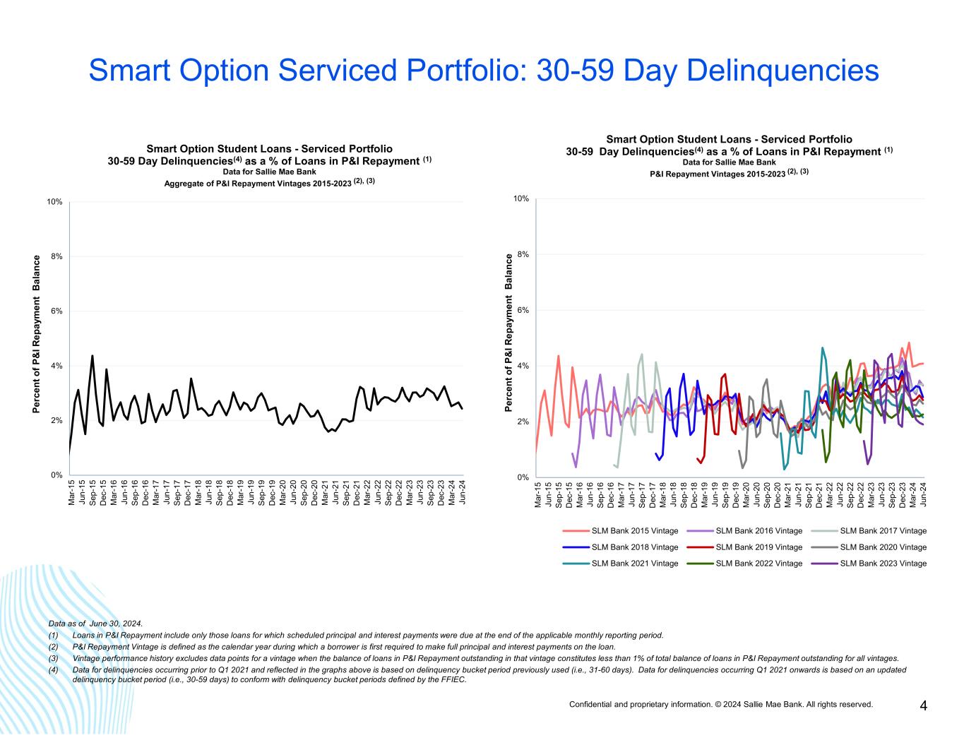 Confidential and proprietary information. © 2024 Sallie Mae Bank. All rights reserved. 3 Important Information Regarding Historical Loan Performance Data TransactionDateTransactionDateTransactionDate SMB Private Education Loan Trust 2021-DAugust 2021SMB Private Education Loan Trust 2018-BJune 2018SMB Private Education Loan Trust 2015-BJuly 2015 SMB Private Education Loan Trust 2021-ENovember 2021SMB Private Education Loan Trust 2018-CSeptember 2018SMB Private Education Loan Trust 2016-AMay 2016 SMB Private Education Loan Trust 2022-CAugust 2022SMB Private Education Loan Trust 2019-AMarch 2019SMB Private Education Loan Trust 2016-BJuly 2016 SMB Private Education Loan Trust 2023-AMarch 2023SMB Private Education Loan Trust 2019-BJune 2019SMB Private Education Loan Trust 2016-COctober 2016 SMB Private Education Loan Trust 2023-CAugust 2023SMB Private Education Loan Trust 2020-AFebruary 2020SMB Private Education Loan Trust 2017-AFebruary 2017 SMB Private Education Loan Trust 2024-CMay 2024SMB Private Education Loan Trust 2020-BAugust 2020SMB Private Education Loan Trust 2017-BNovember 2017 SMB Private Education Loan Trust 2021-BMay 2021SMB Private Education Loan Trust 2018-AMarch 2018 • • • • • • • •