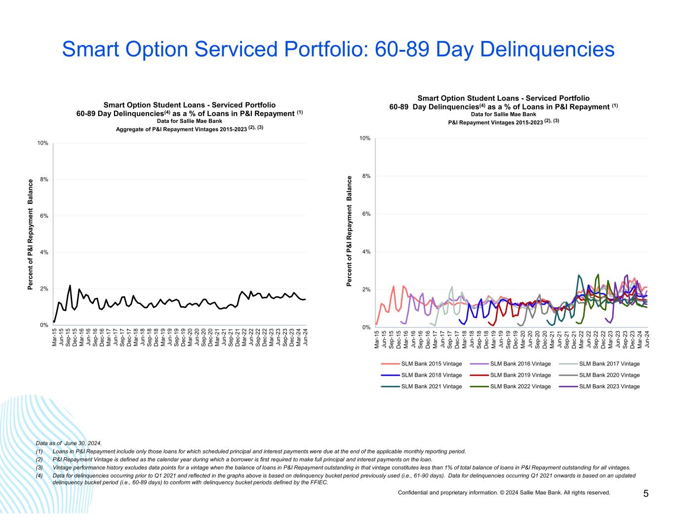 Confidential and proprietary information. © 2024 Sallie Mae Bank. All rights reserved. 4 Smart Option Serviced Portfolio: 30-59 Day Delinquencies 0% 2% 4% 6% 8% 10% M ar -1 5 Ju n -1 5 S ep -1 5 D ec -1 5 M ar -1 6 Ju n -1 6 S ep -1 6 D ec -1 6 M ar -1 7 Ju n -1 7 S ep -1 7 D ec -1 7 M ar -1 8 Ju n -1 8 S ep -1 8 D ec -1 8 M ar -1 9 Ju n -1 9 S ep -1 9 D ec -1 9 M ar -2 0 Ju n -2 0 S ep -2 0 D ec -2 0 M ar -2 1 Ju n -2 1 S ep -2 1 D ec -2 1 M ar -2 2 Ju n -2 2 S ep -2 2 D ec -2 2 M ar -2 3 Ju n -2 3 S ep -2 3 D ec -2 3 M ar -2 4 Ju n -2 4 P e rc e n t o f P & I R e p a ym e n t B a la n c e Smart Option Student Loans - Serviced Portfolio 30-59 Day Delinquencies(4) as a % of Loans in P&I Repayment (1) Data for Sallie Mae Bank Aggregate of P&I Repayment Vintages 2015-2023 (2), (3) Data as of June 30, 2024. (1) Loans in P&I Repayment include only those loans for which scheduled principal and interest payments were due at the end of the applicable monthly reporting period. (2) P&I Repayment Vintage is defined as the calendar year during which a borrower is first required to make full principal and interest payments on the loan. (3) Vintage performance history excludes data points for a vintage when the balance of loans in P&I Repayment outstanding in that vintage constitutes less than 1% of total balance of loans in P&I Repayment outstanding for all vintages. (4) Data for delinquencies occurring prior to Q1 2021 and reflected in the graphs above is based on delinquency bucket period previously used (i.e., 31-60 days). Data for delinquencies occurring Q1 2021 onwards is based on an updated delinquency bucket period (i.e., 30-59 days) to conform with delinquency bucket periods defined by the FFIEC. 0% 2% 4% 6% 8% 10% M ar -1 5 Ju n -1 5 S ep -1 5 D ec -1 5 M ar -1 6 Ju n -1 6 S ep -1 6 D ec -1 6 M ar -1 7 Ju n -1 7 S ep -1 7 D ec -1 7 M ar -1 8 Ju n -1 8 S ep -1 8 D ec -1 8 M ar -1 9 Ju n -1 9 S ep -1 9 D ec -1 9 M ar -2 0 Ju n -2 0 S ep -2 0 D ec -2 0 M ar -2 1 Ju n -2 1 S ep -2 1 D ec -2 1 M ar -2 2 Ju n -2 2 S ep -2 2 D ec -2 2 M ar -2 3 Ju n -2 3 S ep -2 3 D ec -2 3 M ar -2 4 Ju n -2 4 P e rc e n t o f P & I R e p a ym e n t B a la n c e Smart Option Student Loans - Serviced Portfolio 30-59 Day Delinquencies(4) as a % of Loans in P&I Repayment (1) Data for Sallie Mae Bank P&I Repayment Vintages 2015-2023 (2), (3) SLM Bank 2015 Vintage SLM Bank 2016 Vintage SLM Bank 2017 Vintage SLM Bank 2018 Vintage SLM Bank 2019 Vintage SLM Bank 2020 Vintage SLM Bank 2021 Vintage SLM Bank 2022 Vintage SLM Bank 2023 Vintage