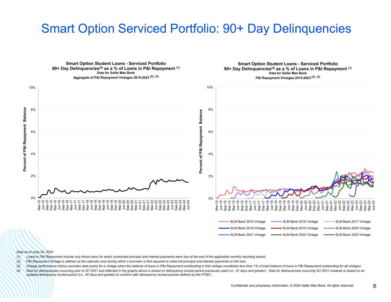 Confidential and proprietary information. © 2024 Sallie Mae Bank. All rights reserved. 5 Smart Option Serviced Portfolio: 60-89 Day Delinquencies 0% 2% 4% 6% 8% 10% M ar -1 5 Ju n -1 5 S ep -1 5 D ec -1 5 M ar -1 6 Ju n -1 6 S ep -1 6 D ec -1 6 M ar -1 7 Ju n -1 7 S ep -1 7 D ec -1 7 M ar -1 8 Ju n -1 8 S ep -1 8 D ec -1 8 M ar -1 9 Ju n -1 9 S ep -1 9 D ec -1 9 M ar -2 0 Ju n -2 0 S ep -2 0 D ec -2 0 M ar -2 1 Ju n -2 1 S ep -2 1 D ec -2 1 M ar -2 2 Ju n -2 2 S ep -2 2 D ec -2 2 M ar -2 3 Ju n -2 3 S ep -2 3 D ec -2 3 M ar -2 4 Ju n -2 4 P e rc e n t o f P & I R e p a ym e n t B a la n c e Smart Option Student Loans - Serviced Portfolio 60-89 Day Delinquencies(4) as a % of Loans in P&I Repayment (1) Data for Sallie Mae Bank Aggregate of P&I Repayment Vintages 2015-2023 (2), (3) 0% 2% 4% 6% 8% 10% M ar -1 5 Ju n -1 5 S ep -1 5 D ec -1 5 M ar -1 6 Ju n -1 6 S ep -1 6 D ec -1 6 M ar -1 7 Ju n -1 7 S ep -1 7 D ec -1 7 M ar -1 8 Ju n -1 8 S ep -1 8 D ec -1 8 M ar -1 9 Ju n -1 9 S ep -1 9 D ec -1 9 M ar -2 0 Ju n -2 0 S ep -2 0 D ec -2 0 M ar -2 1 Ju n -2 1 S ep -2 1 D ec -2 1 M ar -2 2 Ju n -2 2 S ep -2 2 D ec -2 2 M ar -2 3 Ju n -2 3 S ep -2 3 D ec -2 3 M ar -2 4 Ju n -2 4 P e rc e n t o f P & I R e p a ym e n t B a la n c e Smart Option Student Loans - Serviced Portfolio 60-89 Day Delinquencies(4) as a % of Loans in P&I Repayment (1) Data for Sallie Mae Bank P&I Repayment Vintages 2015-2023 (2), (3) SLM Bank 2015 Vintage SLM Bank 2016 Vintage SLM Bank 2017 Vintage SLM Bank 2018 Vintage SLM Bank 2019 Vintage SLM Bank 2020 Vintage SLM Bank 2021 Vintage SLM Bank 2022 Vintage SLM Bank 2023 Vintage Data as of June 30, 2024. (1) Loans in P&I Repayment include only those loans for which scheduled principal and interest payments were due at the end of the applicable monthly reporting period. (2) P&I Repayment Vintage is defined as the calendar year during which a borrower is first required to make full principal and interest payments on the loan. (3) Vintage performance history excludes data points for a vintage when the balance of loans in P&I Repayment outstanding in that vintage constitutes less than 1% of total balance of loans in P&I Repayment outstanding for all vintages. (4) Data for delinquencies occurring prior to Q1 2021 and reflected in the graphs above is based on delinquency bucket period previously used (i.e., 61-90 days). Data for delinquencies occurring Q1 2021 onwards is based on an updated delinquency bucket period (i.e., 60-89 days) to conform with delinquency bucket periods defined by the FFIEC.