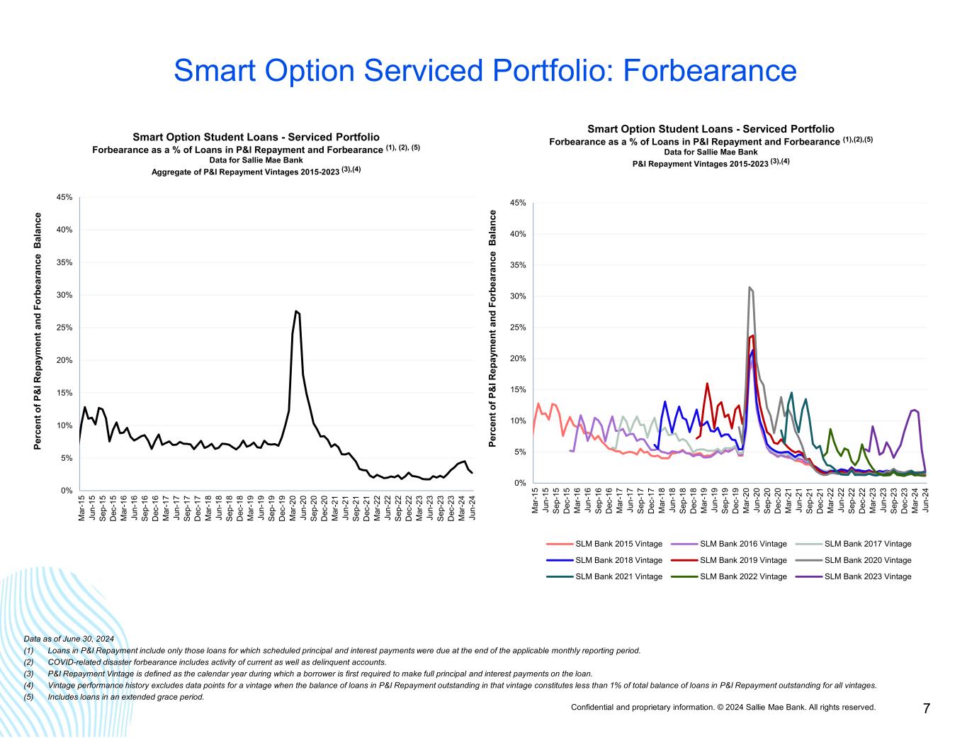 Confidential and proprietary information. © 2024 Sallie Mae Bank. All rights reserved. 6 Smart Option Serviced Portfolio: 90+ Day Delinquencies 0% 2% 4% 6% 8% 10% M ar -1 5 Ju n -1 5 S ep -1 5 D ec -1 5 M ar -1 6 Ju n -1 6 S ep -1 6 D ec -1 6 M ar -1 7 Ju n -1 7 S ep -1 7 D ec -1 7 M ar -1 8 Ju n -1 8 S ep -1 8 D ec -1 8 M ar -1 9 Ju n -1 9 S ep -1 9 D ec -1 9 M ar -2 0 Ju n -2 0 S ep -2 0 D ec -2 0 M ar -2 1 Ju n -2 1 S ep -2 1 D ec -2 1 M ar -2 2 Ju n -2 2 S ep -2 2 D ec -2 2 M ar -2 3 Ju n -2 3 S ep -2 3 D ec -2 3 M ar -2 4 Ju n -2 4 P e rc e n t o f P & I R e p a ym e n t B a la n c e Smart Option Student Loans - Serviced Portfolio 90+ Day Delinquencies(4) as a % of Loans in P&I Repayment (1) Data for Sallie Mae Bank Aggregate of P&I Repayment Vintages 2015-2023 (2), (3) 0% 2% 4% 6% 8% 10% M ar -1 5 Ju n -1 5 S ep -1 5 D ec -1 5 M ar -1 6 Ju n -1 6 S ep -1 6 D ec -1 6 M ar -1 7 Ju n -1 7 S ep -1 7 D ec -1 7 M ar -1 8 Ju n -1 8 S ep -1 8 D ec -1 8 M ar -1 9 Ju n -1 9 S ep -1 9 D ec -1 9 M ar -2 0 Ju n -2 0 S ep -2 0 D ec -2 0 M ar -2 1 Ju n -2 1 S ep -2 1 D ec -2 1 M ar -2 2 Ju n -2 2 S ep -2 2 D ec -2 2 M ar -2 3 Ju n -2 3 S ep -2 3 D ec -2 3 M ar -2 4 Ju n -2 4 P e rc e n t o f P & I R e p a ym e n t B a la n c e Smart Option Student Loans - Serviced Portfolio 90+ Day Delinquencies(4) as a % of Loans in P&I Repayment (1) Data for Sallie Mae Bank P&I Repayment Vintages 2015-2023 (2), (3) SLM Bank 2015 Vintage SLM Bank 2016 Vintage SLM Bank 2017 Vintage SLM Bank 2018 Vintage SLM Bank 2019 Vintage SLM Bank 2020 Vintage SLM Bank 2021 Vintage SLM Bank 2022 Vintage SLM Bank 2023 Vintage Data as of June 30, 2024. (1) Loans in P&I Repayment include only those loans for which scheduled principal and interest payments were due at the end of the applicable monthly reporting period. (2) P&I Repayment Vintage is defined as the calendar year during which a borrower is first required to make full principal and interest payments on the loan. (3) Vintage performance history excludes data points for a vintage when the balance of loans in P&I Repayment outstanding in that vintage constitutes less than 1% of total balance of loans in P&I Repayment outstanding for all vintages. (4) Data for delinquencies occurring prior to Q1 2021 and reflected in the graphs above is based on delinquency bucket period previously used (i.e., 91 days and greater). Data for delinquencies occurring Q1 2021 onwards is based on an updated delinquency bucket period (i.e., 90 days and greater) to conform with delinquency bucket periods defined by the FFIEC.