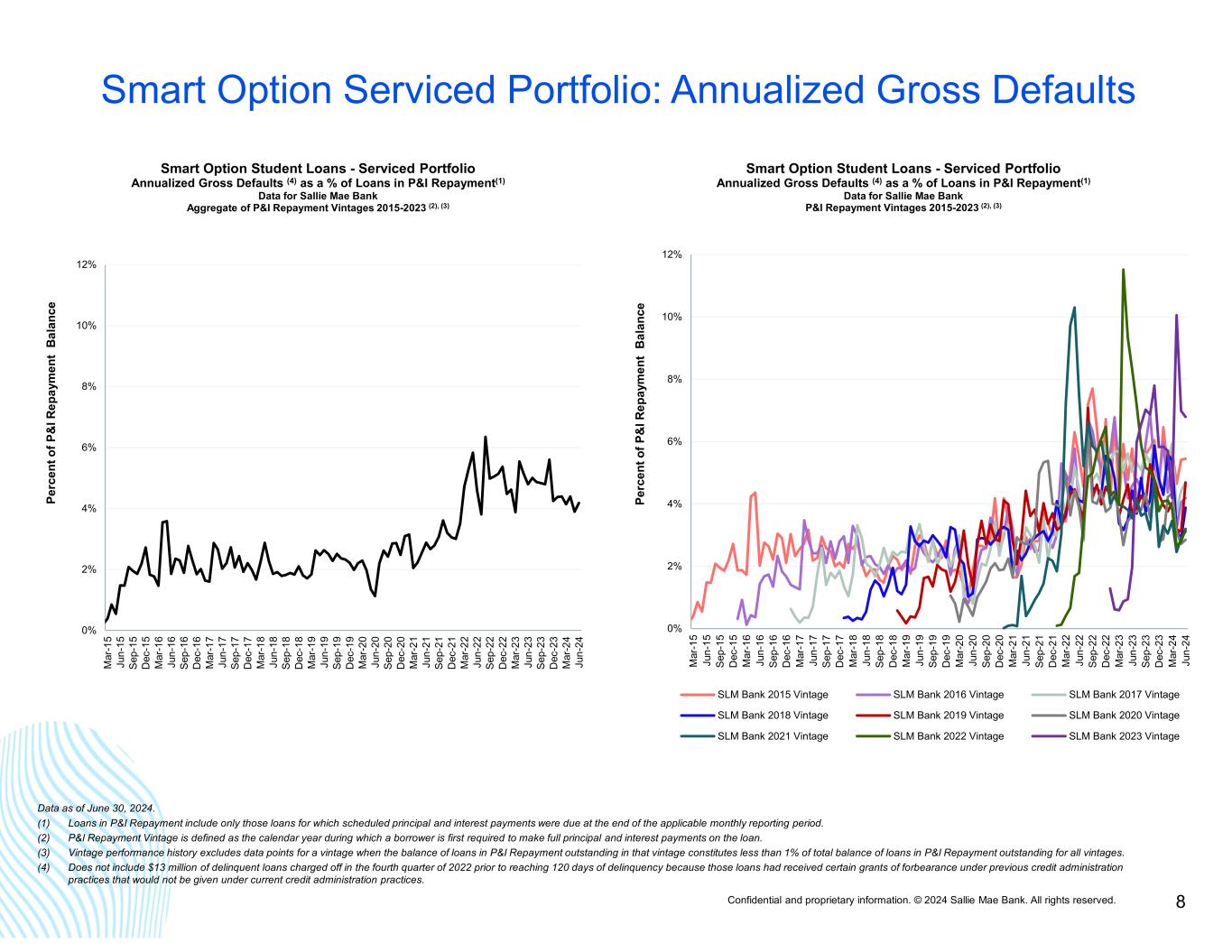Confidential and proprietary information. © 2024 Sallie Mae Bank. All rights reserved. 7 Smart Option Serviced Portfolio: Forbearance 0% 5% 10% 15% 20% 25% 30% 35% 40% 45% M ar -1 5 Ju n -1 5 S ep -1 5 D ec -1 5 M ar -1 6 Ju n -1 6 S ep -1 6 D ec -1 6 M ar -1 7 Ju n -1 7 S ep -1 7 D ec -1 7 M ar -1 8 Ju n -1 8 S ep -1 8 D ec -1 8 M ar -1 9 Ju n -1 9 S ep -1 9 D ec -1 9 M ar -2 0 Ju n -2 0 S ep -2 0 D ec -2 0 M ar -2 1 Ju n -2 1 S ep -2 1 D ec -2 1 M ar -2 2 Ju n -2 2 S ep -2 2 D ec -2 2 M ar -2 3 Ju n -2 3 S ep -2 3 D ec -2 3 M ar -2 4 Ju n -2 4 P e rc e n t o f P & I R e p a ym e n t a n d F o rb e a ra n c e B a la n c e Smart Option Student Loans - Serviced Portfolio Forbearance as a % of Loans in P&I Repayment and Forbearance (1), (2), (5) Data for Sallie Mae Bank Aggregate of P&I Repayment Vintages 2015-2023 (3),(4) 0% 5% 10% 15% 20% 25% 30% 35% 40% 45% M ar -1 5 Ju n -1 5 S ep -1 5 D ec -1 5 M ar -1 6 Ju n -1 6 S ep -1 6 D ec -1 6 M ar -1 7 Ju n -1 7 S ep -1 7 D ec -1 7 M ar -1 8 Ju n -1 8 S ep -1 8 D ec -1 8 M ar -1 9 Ju n -1 9 S ep -1 9 D ec -1 9 M ar -2 0 Ju n -2 0 S ep -2 0 D ec -2 0 M ar -2 1 Ju n -2 1 S ep -2 1 D ec -2 1 M ar -2 2 Ju n -2 2 S ep -2 2 D ec -2 2 M ar -2 3 Ju n -2 3 S ep -2 3 D ec -2 3 M ar -2 4 Ju n -2 4 P e rc e n t o f P & I R e p a ym e n t a n d F o rb e a ra n c e B a la n c e Smart Option Student Loans - Serviced Portfolio Forbearance as a % of Loans in P&I Repayment and Forbearance (1),(2),(5) Data for Sallie Mae Bank P&I Repayment Vintages 2015-2023 (3),(4) SLM Bank 2015 Vintage SLM Bank 2016 Vintage SLM Bank 2017 Vintage SLM Bank 2018 Vintage SLM Bank 2019 Vintage SLM Bank 2020 Vintage SLM Bank 2021 Vintage SLM Bank 2022 Vintage SLM Bank 2023 Vintage Data as of June 30, 2024 (1) Loans in P&I Repayment include only those loans for which scheduled principal and interest payments were due at the end of the applicable monthly reporting period. (2) COVID-related disaster forbearance includes activity of current as well as delinquent accounts. (3) P&I Repayment Vintage is defined as the calendar year during which a borrower is first required to make full principal and interest payments on the loan. (4) Vintage performance history excludes data points for a vintage when the balance of loans in P&I Repayment outstanding in that vintage constitutes less than 1% of total balance of loans in P&I Repayment outstanding for all vintages. (5) Includes loans in an extended grace period.