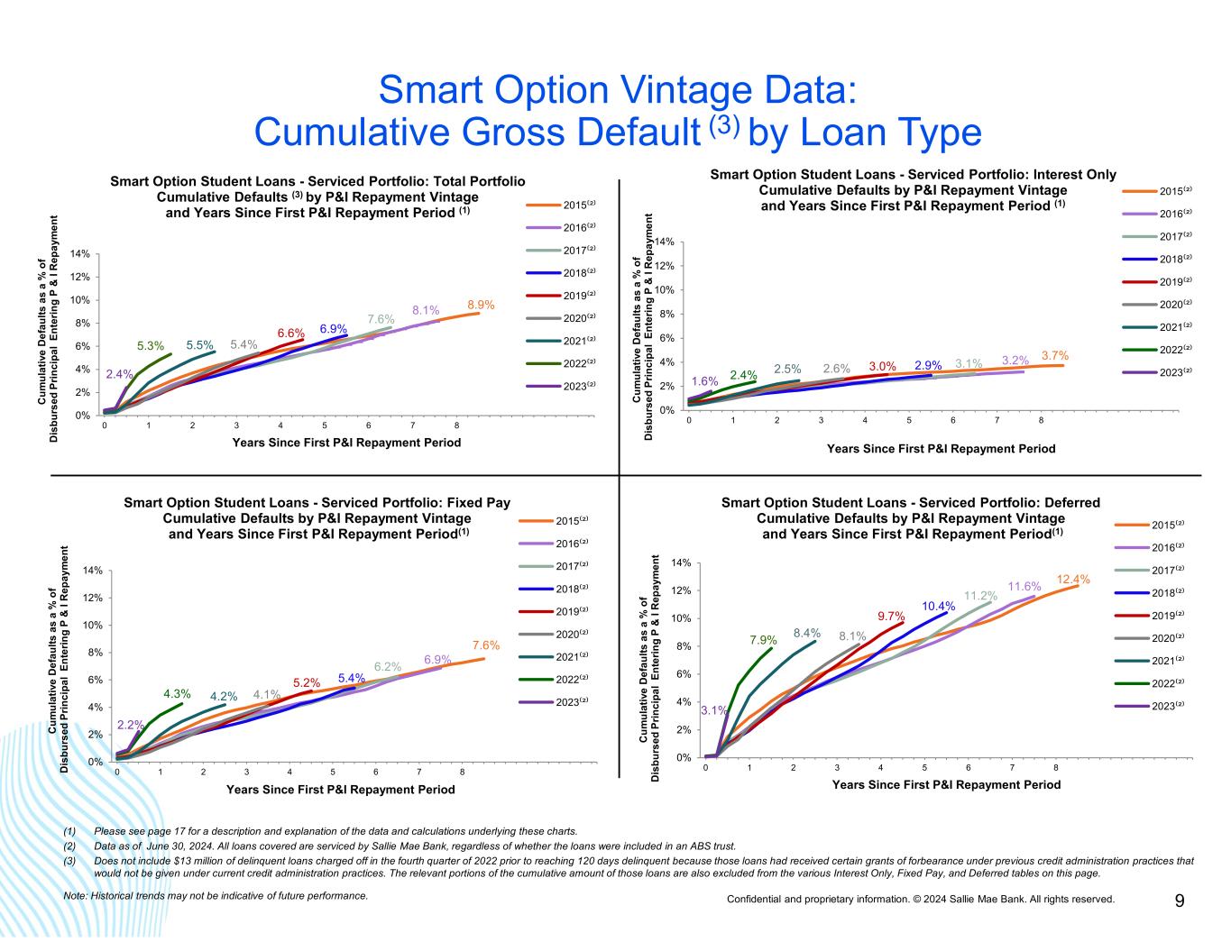 Confidential and proprietary information. © 2024 Sallie Mae Bank. All rights reserved. 8 Smart Option Serviced Portfolio: Annualized Gross Defaults Data as of June 30, 2024. (1) Loans in P&I Repayment include only those loans for which scheduled principal and interest payments were due at the end of the applicable monthly reporting period. (2) P&I Repayment Vintage is defined as the calendar year during which a borrower is first required to make full principal and interest payments on the loan. (3) Vintage performance history excludes data points for a vintage when the balance of loans in P&I Repayment outstanding in that vintage constitutes less than 1% of total balance of loans in P&I Repayment outstanding for all vintages. (4) Does not include $13 million of delinquent loans charged off in the fourth quarter of 2022 prior to reaching 120 days of delinquency because those loans had received certain grants of forbearance under previous credit administration practices that would not be given under current credit administration practices. 0% 2% 4% 6% 8% 10% 12% M ar -1 5 Ju n -1 5 S ep -1 5 D ec -1 5 M ar -1 6 Ju n -1 6 S ep -1 6 D ec -1 6 M ar -1 7 Ju n -1 7 S ep -1 7 D ec -1 7 M ar -1 8 Ju n -1 8 S ep -1 8 D ec -1 8 M ar -1 9 Ju n -1 9 S ep -1 9 D ec -1 9 M ar -2 0 Ju n -2 0 S ep -2 0 D ec -2 0 M ar -2 1 Ju n -2 1 S ep -2 1 D ec -2 1 M ar -2 2 Ju n -2 2 S ep -2 2 D ec -2 2 M ar -2 3 Ju n -2 3 S ep -2 3 D ec -2 3 M ar -2 4 Ju n -2 4 P e rc e n t o f P & I R e p a ym e n t B a la n c e Smart Option Student Loans - Serviced Portfolio Annualized Gross Defaults (4) as a % of Loans in P&I Repayment(1) Data for Sallie Mae Bank Aggregate of P&I Repayment Vintages 2015-2023 (2), (3) 0% 2% 4% 6% 8% 10% 12% M ar -1 5 Ju n -1 5 S ep -1 5 D ec -1 5 M ar -1 6 Ju n -1 6 S ep -1 6 D ec -1 6 M ar -1 7 Ju n -1 7 S ep -1 7 D ec -1 7 M ar -1 8 Ju n -1 8 S ep -1 8 D ec -1 8 M ar -1 9 Ju n -1 9 S ep -1 9 D ec -1 9 M ar -2 0 Ju n -2 0 S ep -2 0 D ec -2 0 M ar -2 1 Ju n -2 1 S ep -2 1 D ec -2 1 M ar -2 2 Ju n -2 2 S ep -2 2 D ec -2 2 M ar -2 3 Ju n -2 3 S ep -2 3 D ec -2 3 M ar -2 4 Ju n -2 4 P e rc e n t o f P & I R e p a ym e n t B a la n c e Smart Option Student Loans - Serviced Portfolio Annualized Gross Defaults (4) as a % of Loans in P&I Repayment(1) Data for Sallie Mae Bank P&I Repayment Vintages 2015-2023 (2), (3) SLM Bank 2015 Vintage SLM Bank 2016 Vintage SLM Bank 2017 Vintage SLM Bank 2018 Vintage SLM Bank 2019 Vintage SLM Bank 2020 Vintage SLM Bank 2021 Vintage SLM Bank 2022 Vintage SLM Bank 2023 Vintage