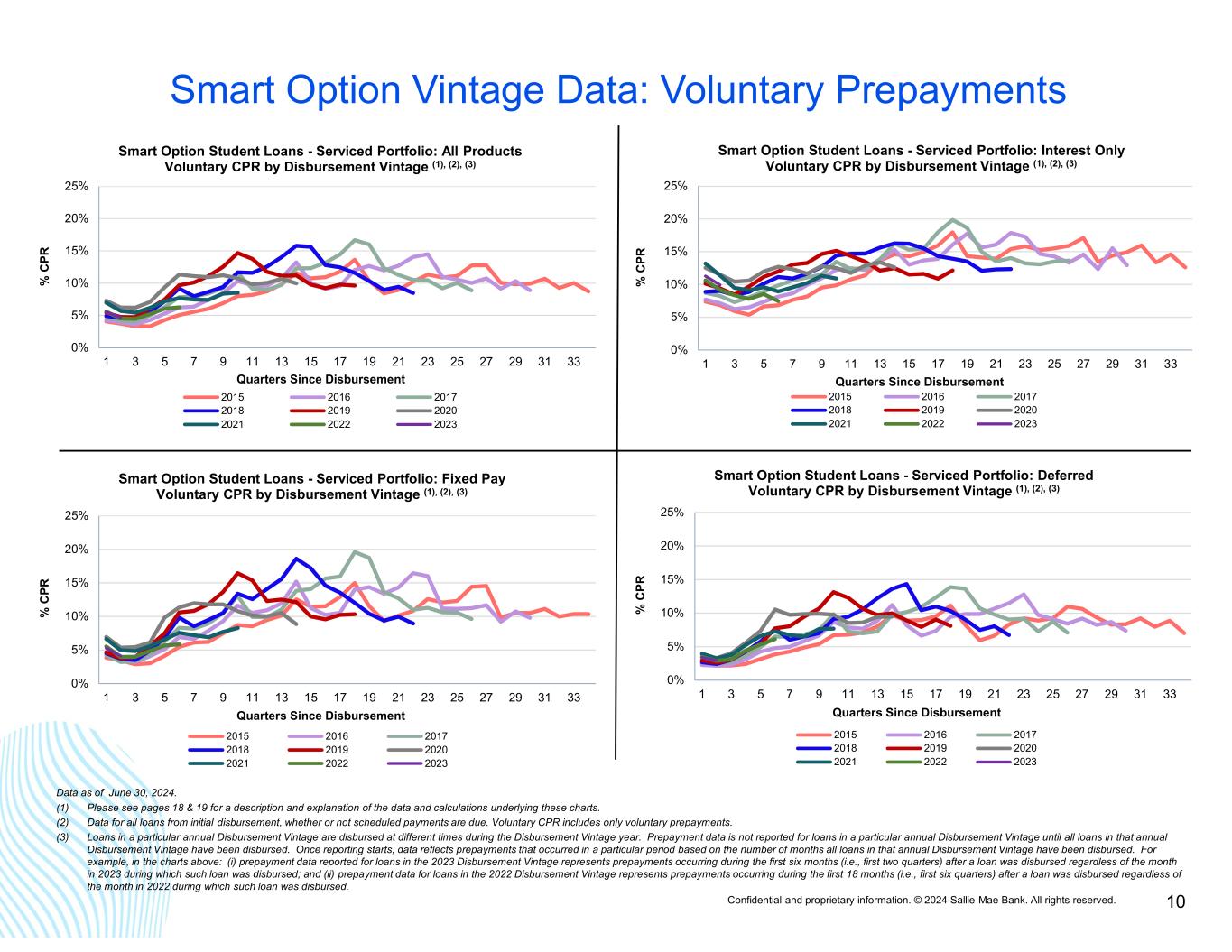 Confidential and proprietary information. © 2024 Sallie Mae Bank. All rights reserved. 9 Smart Option Vintage Data: Cumulative Gross Default (3) by Loan Type 3.7% 3.2% 3.1% 2.9% 3.0% 2.6% 2.5% 2.4% 1.6% 0% 2% 4% 6% 8% 10% 12% 14% 0 1 2 3 4 5 6 7 8 C u m u la ti ve D e fa u lt s a s a % o f D is b u rs e d P ri n c ip a l E n te ri n g P & I R e p a ym e n t Years Since First P&I Repayment Period Smart Option Student Loans - Serviced Portfolio: Interest Only Cumulative Defaults by P&I Repayment Vintage and Years Since First P&I Repayment Period (1) 2015⁽²⁾ 2016⁽²⁾ 2017⁽²⁾ 2018⁽²⁾ 2019⁽²⁾ 2020⁽²⁾ 2021⁽²⁾ 2022⁽²⁾ 2023⁽²⁾ 7.6% 6.9% 6.2% 5.4% 5.2% 4.1% 4.2% 4.3% 2.2% 0% 2% 4% 6% 8% 10% 12% 14% 0 1 2 3 4 5 6 7 8 C u m u la ti ve D e fa u lt s a s a % o f D is b u rs e d P ri n c ip a l E n te ri n g P & I R e p a ym e n t Years Since First P&I Repayment Period Smart Option Student Loans - Serviced Portfolio: Fixed Pay Cumulative Defaults by P&I Repayment Vintage and Years Since First P&I Repayment Period(1) 2015⁽²⁾ 2016⁽²⁾ 2017⁽²⁾ 2018⁽²⁾ 2019⁽²⁾ 2020⁽²⁾ 2021⁽²⁾ 2022⁽²⁾ 2023⁽²⁾ 12.4% 11.6% 11.2% 10.4% 9.7% 8.1% 8.4% 7.9% 3.1% 0% 2% 4% 6% 8% 10% 12% 14% 0 1 2 3 4 5 6 7 8 C u m u la ti ve D e fa u lt s a s a % o f D is b u rs e d P ri n c ip a l E n te ri n g P & I R e p a ym e n t Years Since First P&I Repayment Period Smart Option Student Loans - Serviced Portfolio: Deferred Cumulative Defaults by P&I Repayment Vintage and Years Since First P&I Repayment Period(1) 2015⁽²⁾ 2016⁽²⁾ 2017⁽²⁾ 2018⁽²⁾ 2019⁽²⁾ 2020⁽²⁾ 2021⁽²⁾ 2022⁽²⁾ 2023⁽²⁾ (1) Please see page 17 for a description and explanation of the data and calculations underlying these charts. (2) Data as of June 30, 2024. All loans covered are serviced by Sallie Mae Bank, regardless of whether the loans were included in an ABS trust. (3) Does not include $13 million of delinquent loans charged off in the fourth quarter of 2022 prior to reaching 120 days delinquent because those loans had received certain grants of forbearance under previous credit administration practices that would not be given under current credit administration practices. The relevant portions of the cumulative amount of those loans are also excluded from the various Interest Only, Fixed Pay, and Deferred tables on this page. Note: Historical trends may not be indicative of future performance. 8.9%8.1% 7.6% 6.9% 6.6% 5.4% 5.5% 5.3% 2.4% 0% 2% 4% 6% 8% 10% 12% 14% 0 1 2 3 4 5 6 7 8 C u m u la ti ve D e fa u lt s a s a % o f D is b u rs e d P ri n c ip a l E n te ri n g P & I R e p a ym e n t Years Since First P&I Repayment Period Smart Option Student Loans - Serviced Portfolio: Total Portfolio Cumulative Defaults (3) by P&I Repayment Vintage and Years Since First P&I Repayment Period (1) 2015⁽²⁾ 2016⁽²⁾ 2017⁽²⁾ 2018⁽²⁾ 2019⁽²⁾ 2020⁽²⁾ 2021⁽²⁾ 2022⁽²⁾ 2023⁽²⁾