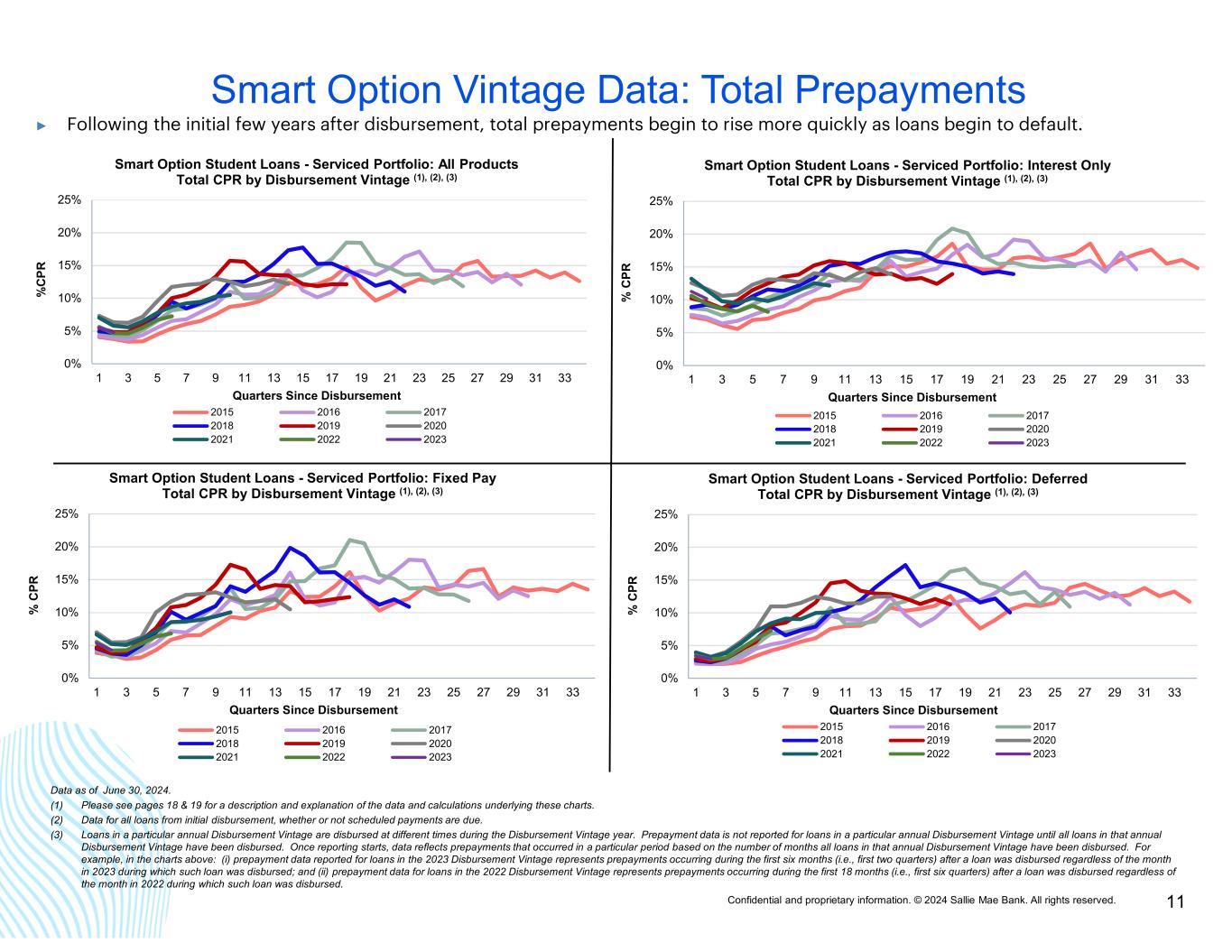 Confidential and proprietary information. © 2024 Sallie Mae Bank. All rights reserved. 10 Smart Option Vintage Data: Voluntary Prepayments Data as of June 30, 2024. (1) Please see pages 18 & 19 for a description and explanation of the data and calculations underlying these charts. (2) Data for all loans from initial disbursement, whether or not scheduled payments are due. Voluntary CPR includes only voluntary prepayments. (3) Loans in a particular annual Disbursement Vintage are disbursed at different times during the Disbursement Vintage year. Prepayment data is not reported for loans in a particular annual Disbursement Vintage until all loans in that annual Disbursement Vintage have been disbursed. Once reporting starts, data reflects prepayments that occurred in a particular period based on the number of months all loans in that annual Disbursement Vintage have been disbursed. For example, in the charts above: (i) prepayment data reported for loans in the 2023 Disbursement Vintage represents prepayments occurring during the first six months (i.e., first two quarters) after a loan was disbursed regardless of the month in 2023 during which such loan was disbursed; and (ii) prepayment data for loans in the 2022 Disbursement Vintage represents prepayments occurring during the first 18 months (i.e., first six quarters) after a loan was disbursed regardless of the month in 2022 during which such loan was disbursed. 0% 5% 10% 15% 20% 25% 1 3 5 7 9 11 13 15 17 19 21 23 25 27 29 31 33 % C P R Quarters Since Disbursement Smart Option Student Loans - Serviced Portfolio: All Products Voluntary CPR by Disbursement Vintage (1), (2), (3) 2015 2016 2017 2018 2019 2020 2021 2022 2023 0% 5% 10% 15% 20% 25% 1 3 5 7 9 11 13 15 17 19 21 23 25 27 29 31 33 % C P R Quarters Since Disbursement Smart Option Student Loans - Serviced Portfolio: Interest Only Voluntary CPR by Disbursement Vintage (1), (2), (3) 2015 2016 2017 2018 2019 2020 2021 2022 2023 0% 5% 10% 15% 20% 25% 1 3 5 7 9 11 13 15 17 19 21 23 25 27 29 31 33 % C P R Quarters Since Disbursement Smart Option Student Loans - Serviced Portfolio: Fixed Pay Voluntary CPR by Disbursement Vintage (1), (2), (3) 2015 2016 2017 2018 2019 2020 2021 2022 2023 0% 5% 10% 15% 20% 25% 1 3 5 7 9 11 13 15 17 19 21 23 25 27 29 31 33 % C P R Quarters Since Disbursement Smart Option Student Loans - Serviced Portfolio: Deferred Voluntary CPR by Disbursement Vintage (1), (2), (3) 2015 2016 2017 2018 2019 2020 2021 2022 2023