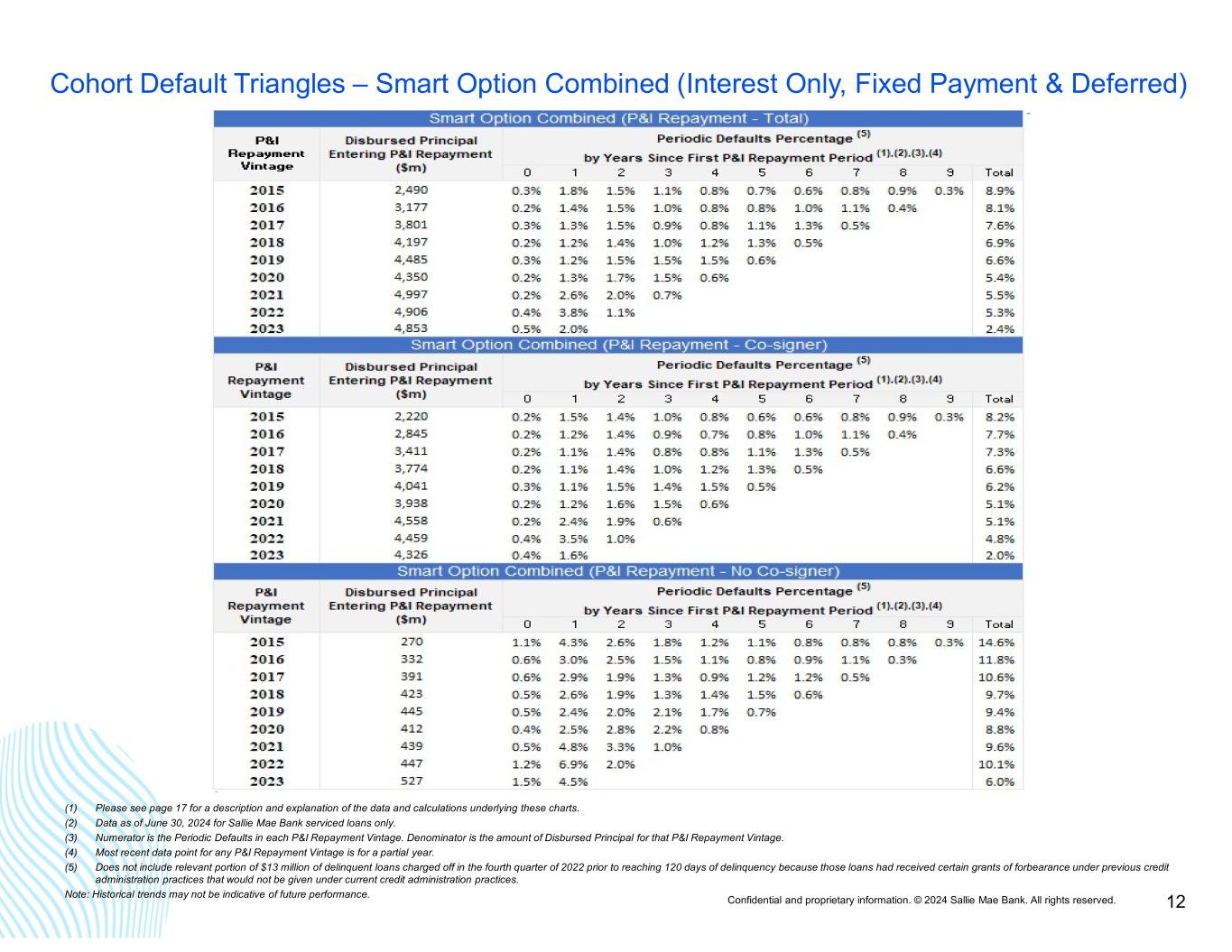 Confidential and proprietary information. © 2024 Sallie Mae Bank. All rights reserved. 11 Smart Option Vintage Data: Total Prepayments ► Data as of June 30, 2024. (1) Please see pages 18 & 19 for a description and explanation of the data and calculations underlying these charts. (2) Data for all loans from initial disbursement, whether or not scheduled payments are due. (3) Loans in a particular annual Disbursement Vintage are disbursed at different times during the Disbursement Vintage year. Prepayment data is not reported for loans in a particular annual Disbursement Vintage until all loans in that annual Disbursement Vintage have been disbursed. Once reporting starts, data reflects prepayments that occurred in a particular period based on the number of months all loans in that annual Disbursement Vintage have been disbursed. For example, in the charts above: (i) prepayment data reported for loans in the 2023 Disbursement Vintage represents prepayments occurring during the first six months (i.e., first two quarters) after a loan was disbursed regardless of the month in 2023 during which such loan was disbursed; and (ii) prepayment data for loans in the 2022 Disbursement Vintage represents prepayments occurring during the first 18 months (i.e., first six quarters) after a loan was disbursed regardless of the month in 2022 during which such loan was disbursed. 0% 5% 10% 15% 20% 25% 1 3 5 7 9 11 13 15 17 19 21 23 25 27 29 31 33 % C P R Quarters Since Disbursement Smart Option Student Loans - Serviced Portfolio: All Products Total CPR by Disbursement Vintage (1), (2), (3) 2015 2016 2017 2018 2019 2020 2021 2022 2023 0% 5% 10% 15% 20% 25% 1 3 5 7 9 11 13 15 17 19 21 23 25 27 29 31 33 % C P R Quarters Since Disbursement Smart Option Student Loans - Serviced Portfolio: Fixed Pay Total CPR by Disbursement Vintage (1), (2), (3) 2015 2016 2017 2018 2019 2020 2021 2022 2023 0% 5% 10% 15% 20% 25% 1 3 5 7 9 11 13 15 17 19 21 23 25 27 29 31 33 % C P R Quarters Since Disbursement Smart Option Student Loans - Serviced Portfolio: Deferred Total CPR by Disbursement Vintage (1), (2), (3) 2015 2016 2017 2018 2019 2020 2021 2022 2023 0% 5% 10% 15% 20% 25% 1 3 5 7 9 11 13 15 17 19 21 23 25 27 29 31 33 % C P R Quarters Since Disbursement Smart Option Student Loans - Serviced Portfolio: Interest Only Total CPR by Disbursement Vintage (1), (2), (3) 2015 2016 2017 2018 2019 2020 2021 2022 2023