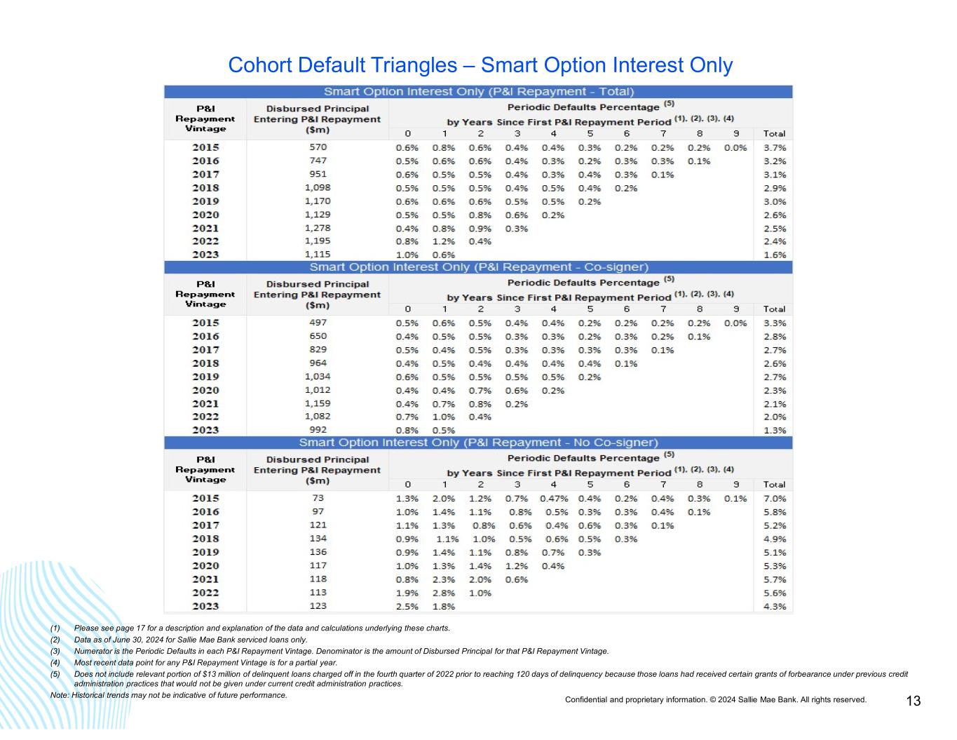 Confidential and proprietary information. © 2024 Sallie Mae Bank. All rights reserved. 12 Cohort Default Triangles – Smart Option Combined (Interest Only, Fixed Payment & Deferred) (1) Please see page 17 for a description and explanation of the data and calculations underlying these charts. (2) Data as of June 30, 2024 for Sallie Mae Bank serviced loans only. (3) Numerator is the Periodic Defaults in each P&I Repayment Vintage. Denominator is the amount of Disbursed Principal for that P&I Repayment Vintage. (4) Most recent data point for any P&I Repayment Vintage is for a partial year. (5) Does not include relevant portion of $13 million of delinquent loans charged off in the fourth quarter of 2022 prior to reaching 120 days of delinquency because those loans had received certain grants of forbearance under previous credit administration practices that would not be given under current credit administration practices. Note: Historical trends may not be indicative of future performance.