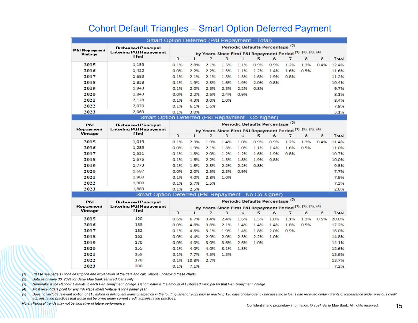 Confidential and proprietary information. © 2024 Sallie Mae Bank. All rights reserved. 14 Cohort Default Triangles – Smart Option Fixed Payment (1) Please see page 17 for a description and explanation of the data and calculations underlying these charts. (2) Data as of June 30, 2024 for Sallie Mae Bank serviced loans only. (3) Numerator is the Periodic Defaults in each P&I Repayment Vintage. Denominator is the amount of Disbursed Principal for that P&I Repayment Vintage. (4) Most recent data point for any P&I Repayment Vintage is for a partial year. (5) Does not include relevant portion of $13 million of delinquent loans charged off in the fourth quarter of 2022 prior to reaching 120 days of delinquency because those loans had received certain grants of forbearance under previous credit administration practices that would not be given under current credit administration practices. Note: Historical trends may not be indicative of future performance.