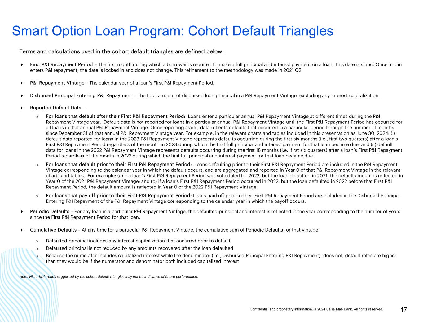 Confidential and proprietary information. © 2024 Sallie Mae Bank. All rights reserved. 15 Cohort Default Triangles – Smart Option Deferred Payment (1) Please see page 17 for a description and explanation of the data and calculations underlying these charts. (2) Data as of June 30, 2024 for Sallie Mae Bank serviced loans only. (3) Numerator is the Periodic Defaults in each P&I Repayment Vintage. Denominator is the amount of Disbursed Principal for that P&I Repayment Vintage. (4) Most recent data point for any P&I Repayment Vintage is for a partial year. (5) Does not include relevant portion of $13 million of delinquent loans charged off in the fourth quarter of 2022 prior to reaching 120 days of delinquency because those loans had received certain grants of forbearance under previous credit administration practices that would not be given under current credit administration practices. Note: Historical trends may not be indicative of future performance.
