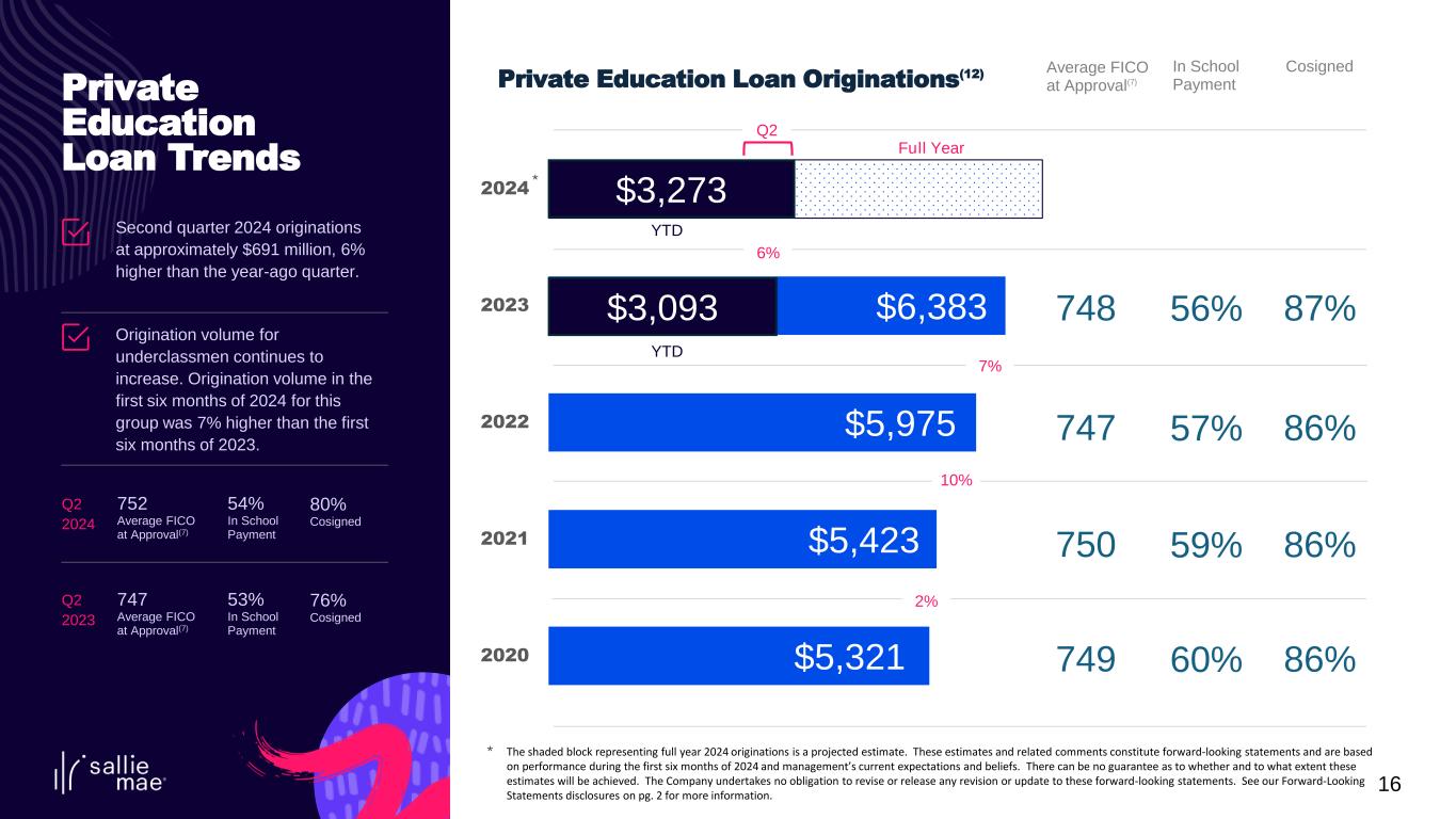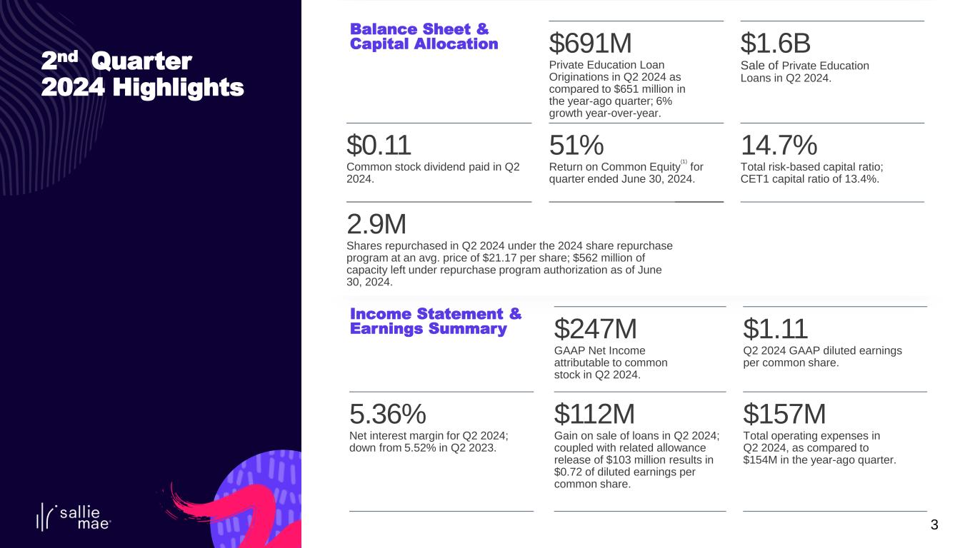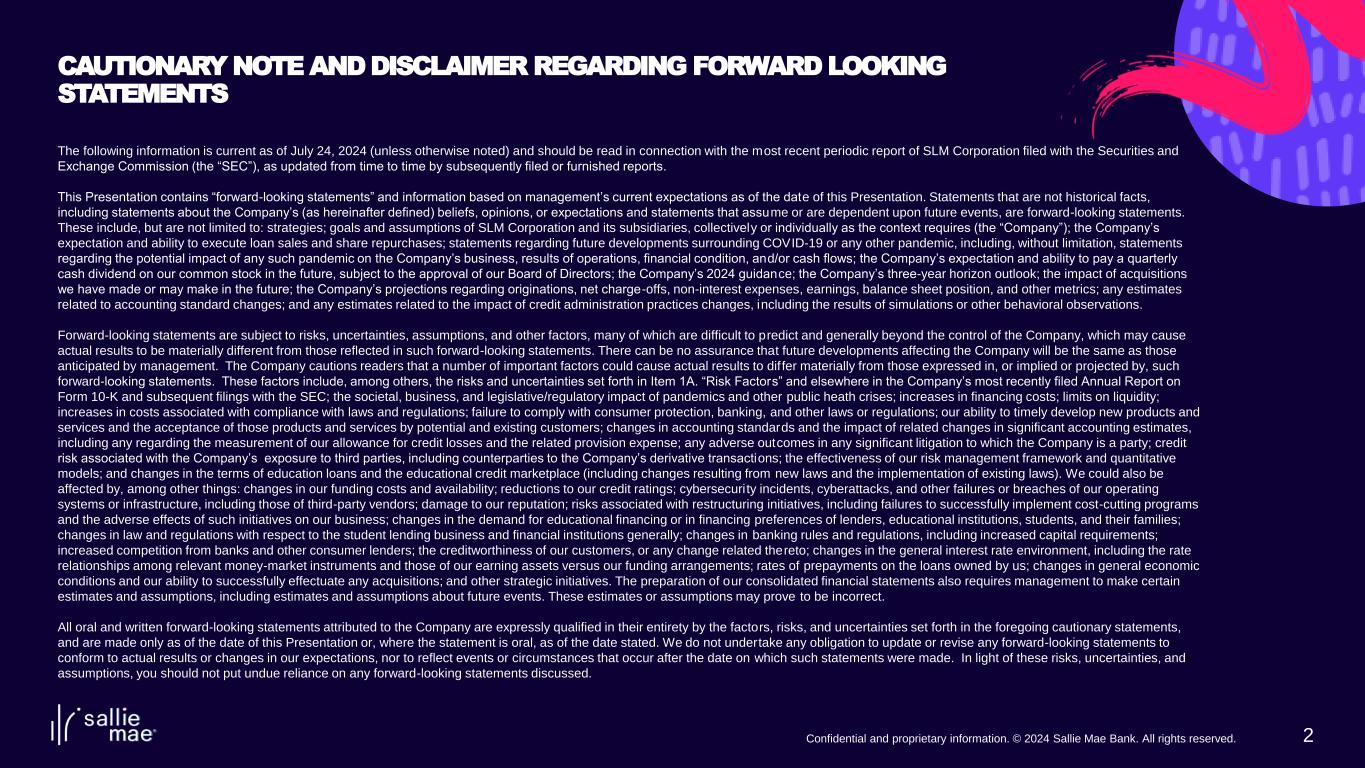2 The following information is current as of July 24, 2024 (unless otherwise noted) and should be read in connection with the most recent periodic report of SLM Corporation filed with the Securities and Exchange Commission (the “SEC”), as updated from time to time by subsequently filed or furnished reports. This Presentation contains “forward-looking statements” and information based on management’s current expectations as of the date of this Presentation. Statements that are not historical facts, including statements about the Company’s (as hereinafter defined) beliefs, opinions, or expectations and statements that assume or are dependent upon future events, are forward-looking statements. These include, but are not limited to: strategies; goals and assumptions of SLM Corporation and its subsidiaries, collectively or individually as the context requires (the “Company”); the Company’s expectation and ability to execute loan sales and share repurchases; statements regarding future developments surrounding COVID-19 or any other pandemic, including, without limitation, statements regarding the potential impact of any such pandemic on the Company’s business, results of operations, financial condition, and/or cash flows; the Company’s expectation and ability to pay a quarterly cash dividend on our common stock in the future, subject to the approval of our Board of Directors; the Company’s 2024 guidance; the Company’s three-year horizon outlook; the impact of acquisitions we have made or may make in the future; the Company’s projections regarding originations, net charge-offs, non-interest expenses, earnings, balance sheet position, and other metrics; any estimates related to accounting standard changes; and any estimates related to the impact of credit administration practices changes, including the results of simulations or other behavioral observations. Forward-looking statements are subject to risks, uncertainties, assumptions, and other factors, many of which are difficult to predict and generally beyond the control of the Company, which may cause actual results to be materially different from those reflected in such forward-looking statements. There can be no assurance that future developments affecting the Company will be the same as those anticipated by management. The Company cautions readers that a number of important factors could cause actual results to differ materially from those expressed in, or implied or projected by, such forward-looking statements. These factors include, among others, the risks and uncertainties set forth in Item 1A. “Risk Factors” and elsewhere in the Company’s most recently filed Annual Report on Form 10-K and subsequent filings with the SEC; the societal, business, and legislative/regulatory impact of pandemics and other public heath crises; increases in financing costs; limits on liquidity; increases in costs associated with compliance with laws and regulations; failure to comply with consumer protection, banking, and other laws or regulations; our ability to timely develop new products and services and the acceptance of those products and services by potential and existing customers; changes in accounting standards and the impact of related changes in significant accounting estimates, including any regarding the measurement of our allowance for credit losses and the related provision expense; any adverse outcomes in any significant litigation to which the Company is a party; credit risk associated with the Company’s exposure to third parties, including counterparties to the Company’s derivative transactions; the effectiveness of our risk management framework and quantitative models; and changes in the terms of education loans and the educational credit marketplace (including changes resulting from new laws and the implementation of existing laws). We could also be affected by, among other things: changes in our funding costs and availability; reductions to our credit ratings; cybersecurity incidents, cyberattacks, and other failures or breaches of our operating systems or infrastructure, including those of third-party vendors; damage to our reputation; risks associated with restructuring initiatives, including failures to successfully implement cost-cutting programs and the adverse effects of such initiatives on our business; changes in the demand for educational financing or in financing preferences of lenders, educational institutions, students, and their families; changes in law and regulations with respect to the student lending business and financial institutions generally; changes in banking rules and regulations, including increased capital requirements; increased competition from banks and other consumer lenders; the creditworthiness of our customers, or any change related thereto; changes in the general interest rate environment, including the rate relationships among relevant money-market instruments and those of our earning assets versus our funding arrangements; rates of prepayments on the loans owned by us; changes in general economic conditions and our ability to successfully effectuate any acquisitions; and other strategic initiatives. The preparation of our consolidated financial statements also requires management to make certain estimates and assumptions, including estimates and assumptions about future events. These estimates or assumptions may prove to be incorrect. All oral and written forward-looking statements attributed to the Company are expressly qualified in their entirety by the factors, risks, and uncertainties set forth in the foregoing cautionary statements, and are made only as of the date of this Presentation or, where the statement is oral, as of the date stated. We do not undertake any obligation to update or revise any forward-looking statements to conform to actual results or changes in our expectations, nor to reflect events or circumstances that occur after the date on which su