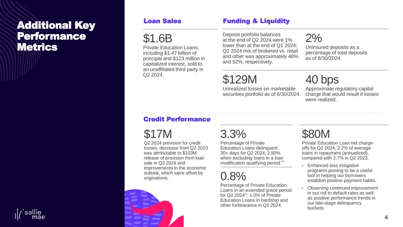 3 $247M GAAP Net Income attributable to common stock in Q2 2024. $1.11 Q2 2024 GAAP diluted earnings per common share. 5.36% Net interest margin for Q2 2024; down from 5.52% in Q2 2023. $112M Gain on sale of loans in Q2 2024; coupled with related allowance release of $103 million results in $0.72 of diluted earnings per common share. $157M Total operating expenses in Q2 2024, as compared to $154M in the year-ago quarter. 2nd Quarter 2024 Highlights $691M Private Education Loan Originations in Q2 2024 as compared to $651 million in the year-ago quarter; 6% growth year-over-year. $1.6B Sale of Private Education Loans in Q2 2024. $0.11 Common stock dividend paid in Q2 2024. 51% Return on Common Equity (1) for quarter ended June 30, 2024. 14.7% Total risk-based capital ratio; CET1 capital ratio of 13.4%. 2.9M Shares repurchased in Q2 2024 under the 2024 share repurchase program at an avg. price of $21.17 per share; $562 million of capacity left under repurchase program authorization as of June 30, 2024. Balance Sheet & Capital Allocation Income Statement & Earnings Summary
