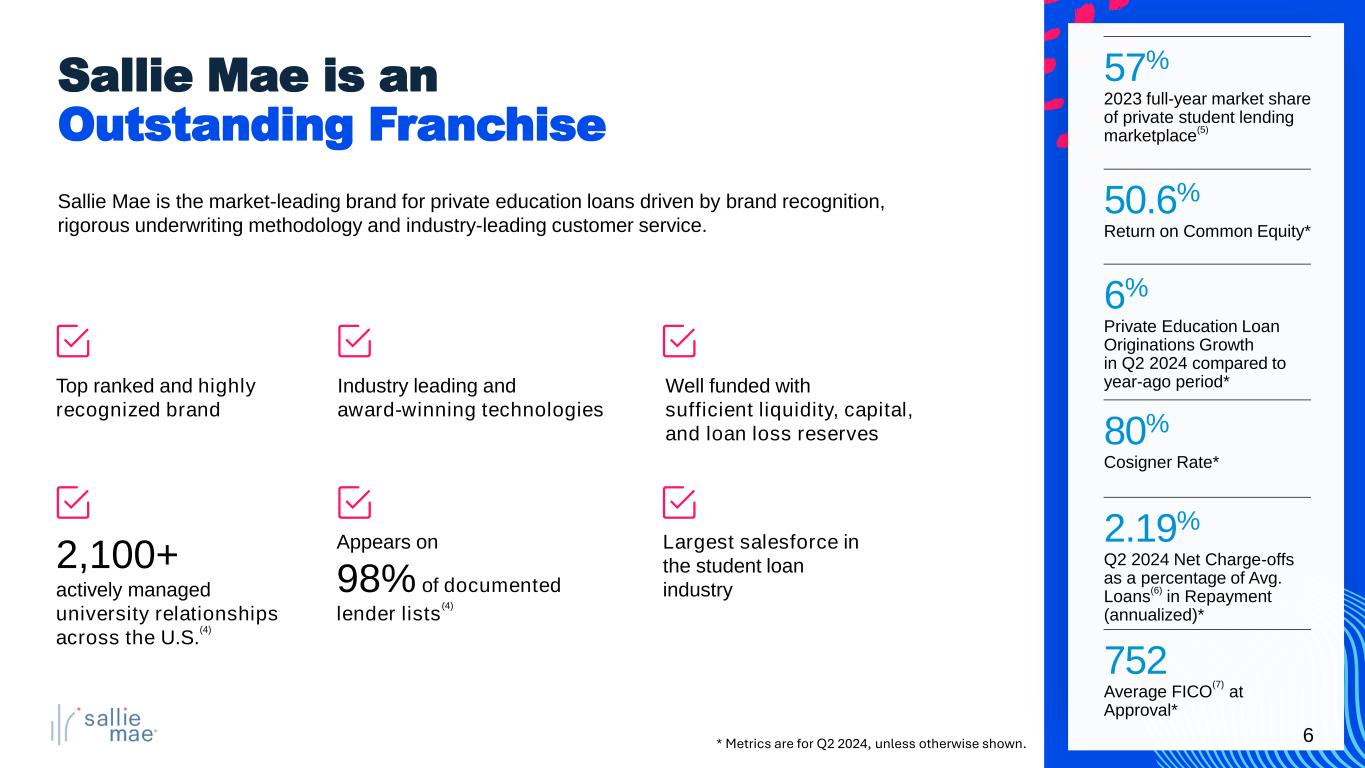 5 Outstanding financial track record with strong EPS performance and ROCE Well-positioned in large and growing private student loan market, with powerful brand recognition and attractive client base Consistent profitability, balance sheet strength and strong risk and compliance functions to mitigate enterprise-wide risk and support resiliency of results Rigorous and consistent capital allocation and return program in place to enhance shareholder value A Compelling Investment Opportunity Significant potential for profitable growth and shareholder returns nearing conclusion of CECL Phase-in Period