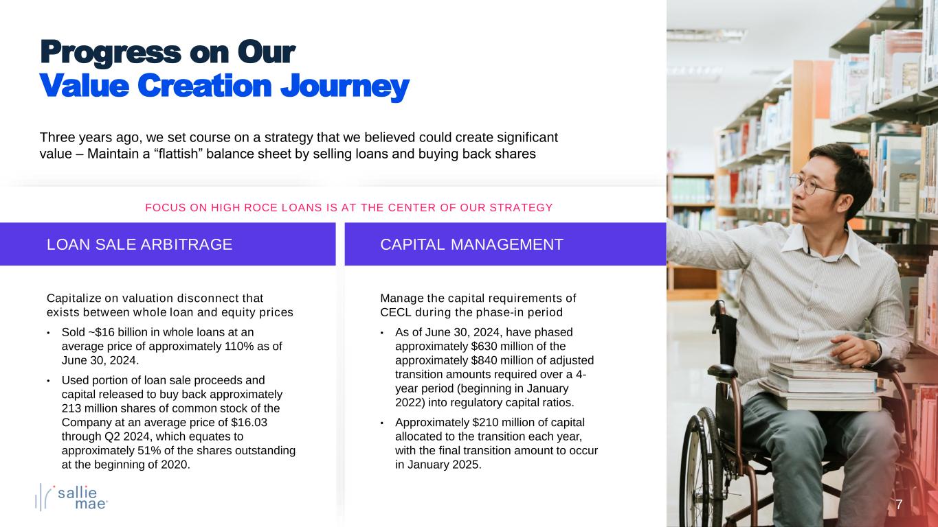 6 57% 2023 full-year market share of private student lending marketplace (5) 50.6% Return on Common Equity* 6% Private Education Loan Originations Growth in Q2 2024 compared to year-ago period* 80% Cosigner Rate* 2.19% Q2 2024 Net Charge-offs as a percentage of Avg. Loans (6) in Repayment (annualized)* 752 Average FICO (7) at Approval* Top ranked and highly recognized brand Industry leading and award-winning technologies Well funded with sufficient liquidity, capital, and loan loss reserves Sallie Mae is the market-leading brand for private education loans driven by brand recognition, rigorous underwriting methodology and industry-leading customer service. 2,100+ actively managed university relationships across the U.S. (4) Appears on 98% of documented lender lists (4) Largest salesforce in the student loan industry Sallie Mae is an Outstanding Franchise * Metrics are for Q2 2024, unless otherwise shown.