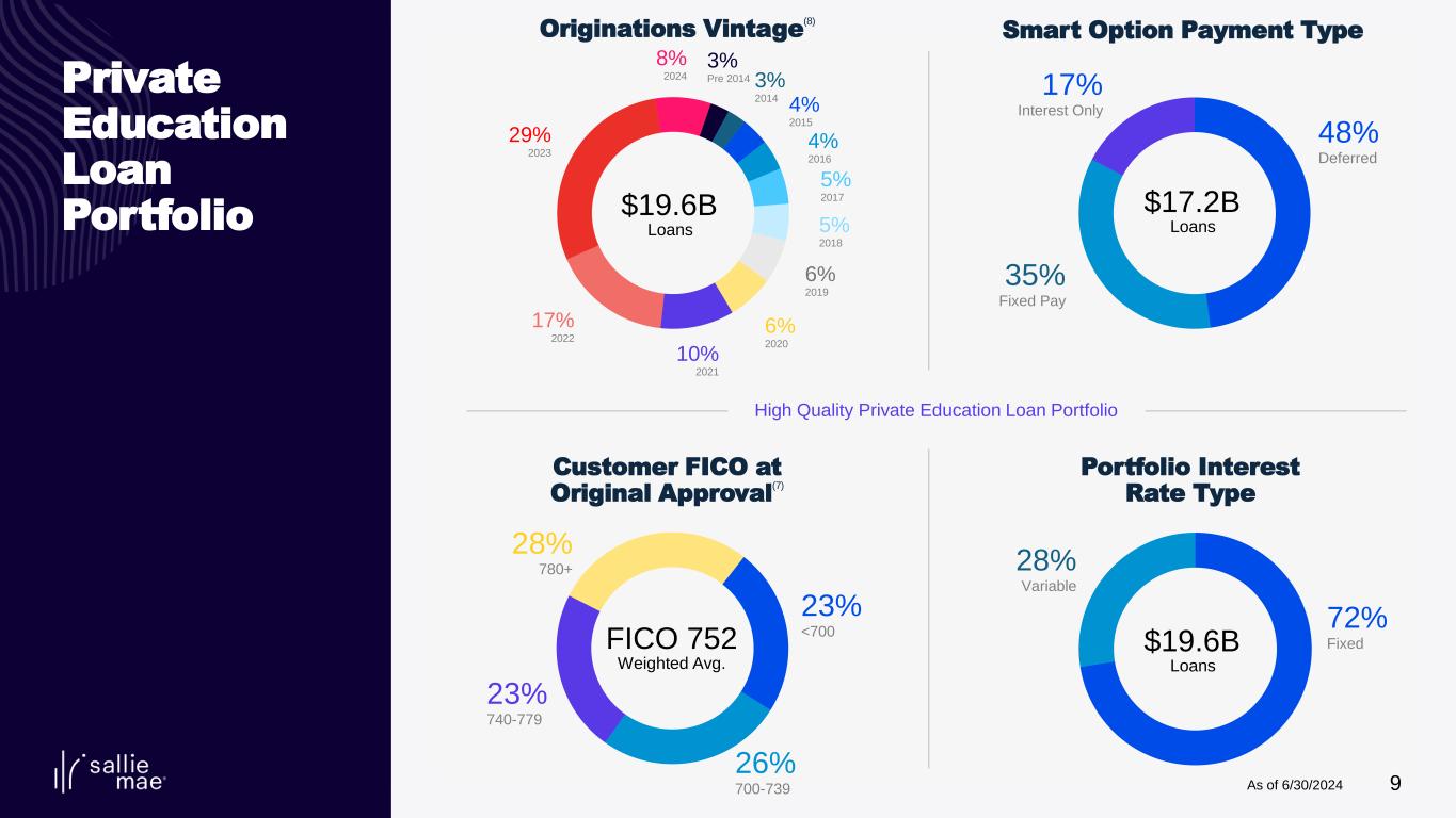8 Providing Customers with Financial Backing, Information and Tools to Achieve Their Goals SALLIE MAE BANK Offers traditional savings products • High-yield savings accounts • Money market accounts • Certificates of deposit Originates Private Education Loans Owns portfolio that includes loans insured or guaranteed under the previously existing Federal Family Education Loan Program PRIVATE EDUCATION LOANS Smart Option Student Loans Emphasize in-school payment features that can produce shorter terms and reduce customers’ total finance charges Graduate Student Loans Six loan products for specific graduate programs of study SLM Portfolio