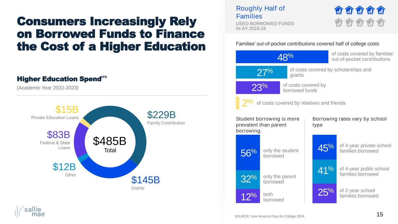15 Consumers Increasingly Rely on Borrowed Funds to Finance the Cost of a Higher Education Roughly Half of Families Student borrowing is more prevalent than parent borrowing. Borrowing rates vary by school type USED BORROWED FUNDS IN AY 2023-24 SOURCE: How America Pays for College 2024 Families’ out-of-pocket contributions covered half of college costs $229B Family Contribution $145B Grants $12B Other $15B Private Education Loans Higher Education Spend (11) (Academic Year 2022-2023) $83B Federal & State Loans $485B Total 56% only the student borrowed 32% only the parent borrowed 12% both borrowed 45% of 4-year private school families borrowed 41% of 4-year public school families borrowed 25% of 2-year school families borrowed of costs covered by families’ out-of-pocket contributions of costs covered by scholarships and grants of costs covered by borrowed funds of costs covered by relatives and friends 48% 27% 23% 2%