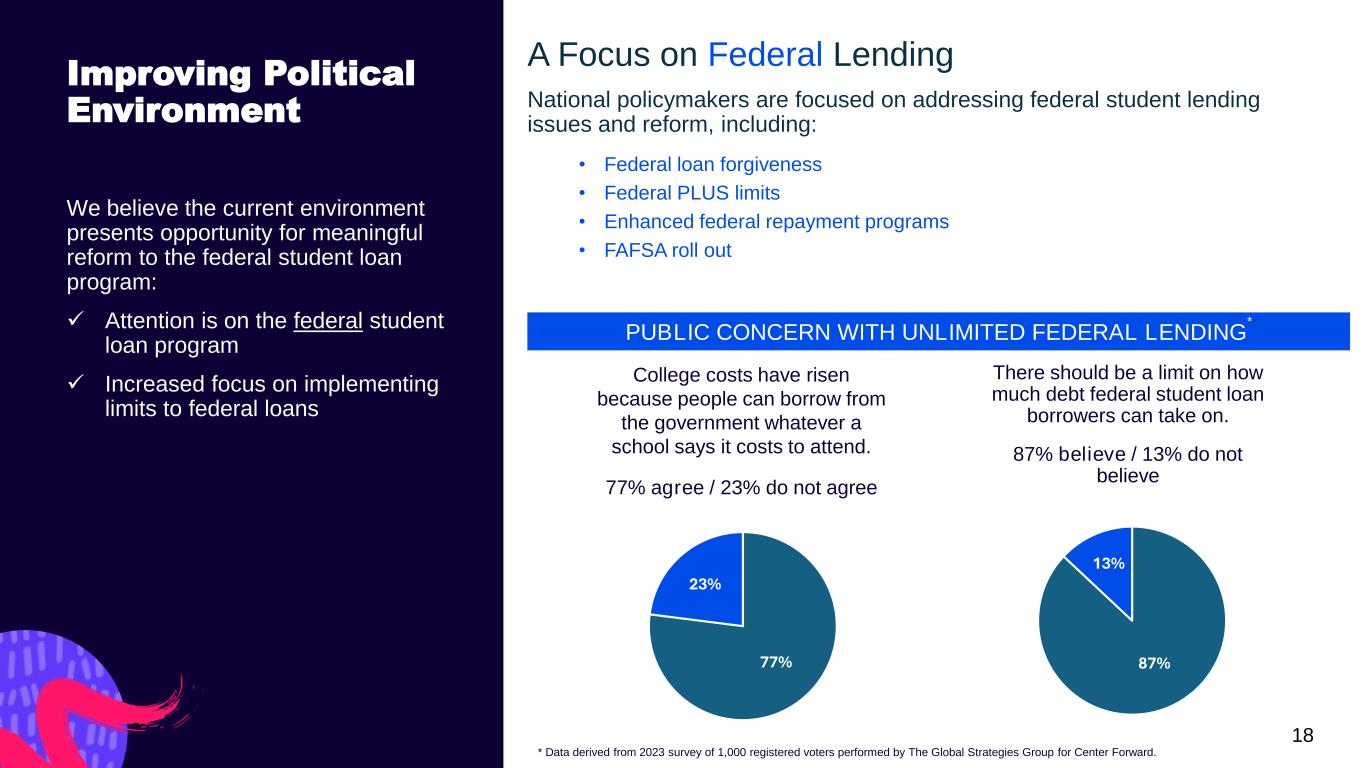 18 Improving Political Environment A Focus on Federal Lending National policymakers are focused on addressing federal student lending issues and reform, including: • Federal loan forgiveness • Federal PLUS limits • Enhanced federal repayment programs • FAFSA roll out We believe the current environment presents opportunity for meaningful reform to the federal student loan program: ✓ Attention is on the federal student loan program ✓ Increased focus on implementing limits to federal loans 77% 23% 87% 13% There should be a limit on how much debt federal student loan borrowers can take on. 87% believe / 13% do not believe * Data derived from 2023 survey of 1,000 registered voters performed by The Global Strategies Group for Center Forward. College costs have risen because people can borrow from the government whatever a school says it costs to attend. 77% agree / 23% do not agree PUBLIC CONCERN WITH UNLIMITED FEDERAL LENDING *