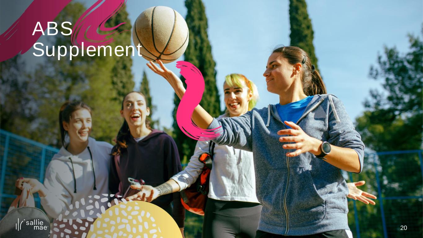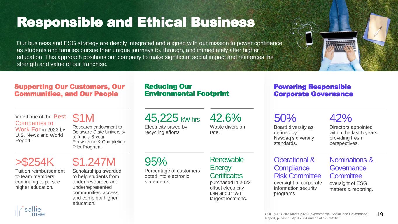 19 v 45,225 kW-hrs Electricity saved by recycling efforts. 42.6% Waste diversion rate. 95% Percentage of customers opted into electronic statements. Renewable Energy Certificates purchased in 2023 offset electricity use at our two largest locations. Our business and ESG strategy are deeply integrated and aligned with our mission to power confidence as students and families pursue their unique journeys to, through, and immediately after higher education. This approach positions our company to make significant social impact and reinforces the strength and value of our franchise. Responsible and Ethical Business Reducing Our Environmental Footprint Voted one of the Best Companies to Work For in 2023 by U.S. News and World Report. $1M Research endowment to Delaware State University to fund a 3-year Persistence & Completion Pilot Program. >$254K Tuition reimbursement to team members continuing to pursue higher education. $1.247M Scholarships awarded to help students from under resourced and underrepresented communities' access and complete higher education. Supporting Our Customers, Our Communities, and Our People Powering Responsible Corporate Governance 50% Board diversity as defined by Nasdaq’s diversity standards. 42% Directors appointed within the last 5 years, providing fresh perspectives. Operational & Compliance Risk Committee oversight of corporate information security programs. Nominations & Governance Committee oversight of ESG matters & reporting. SOURCE: Sallie Mae’s 2023 Environmental, Social, and Governance Report, published April 2024 and as of 12/31/2023