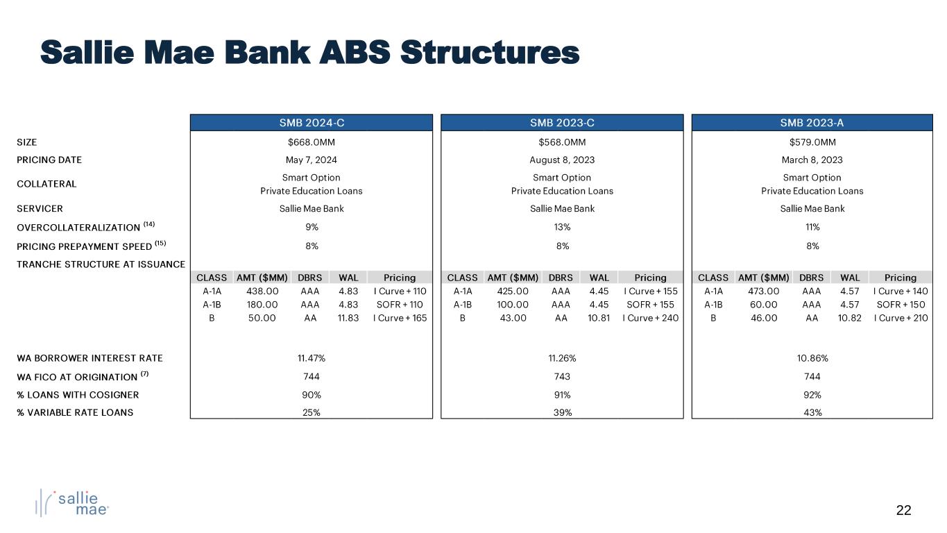 21 Sallie Mae Bank ABS Summary* * Pool characteristics as of the Statistical Cutoff Date for the respective transaction. 14-A 15-A 15-B 15-C 16-A 16-B 16-C 17-A 17-B 18-A 18-B 18-C 19-A 19-B 20-A 20-B 21-B 21-D 21-E 22-C 23-A 23-C 24-C Issuance Date 8/7/14 4/23/15 7/30/15 10/27/15 5/26/16 7/21/16 10/12/16 2/8/17 11/8/17 3/21/18 6/20/18 9/19/18 3/13/19 6/12/19 2/12/20 8/12/20 5/19/21 8/18/21 11/9/21 8/9/22 3/15/23 8/16/23 5/15/24 Total Bond Amount ($mil) $382 $704 $714 $701 $551 $657 $674 $772 $676 $670 $687 $544 $453 $657 $636 $707 $531 $527 $534 $575 $579 $568 $668 Initial AAA Enhancement (%) 21% 23% 22% 23% 20% 19% 17% 17% 18% 18% 17% 17% 18% 15% 15% 19% 12% 13% 12% 22% 18% 19% 16% Initial Class B Enhancement (%) 12% 13% 13% 14% 12% 12% 10% 11% 11% 11% 10% 10% 11% 8% 8% 12% 5% 6% 5% 16% 11% 13% 9% Wtd Avg Spread over Benchmarks 'AAA' Rated A Classes (%) +1.17% +1.01% +1.27% +1.49% +1.38% +1.36% +1.00% +0.82% +0.70% +0.71% +0.66% +0.67% +0.82% +0.91% +0.76% +1.10% +0.70% +0.62% +0.63% +1.64% +1.41% +1.55% +1.10% A and B Classes Combined (%) +1.39% +1.28% +1.50% +1.74% +1.60% +1.55% +1.15% +0.93% +0.80% +0.78% +0.76% +0.77% +0.92% +1.01% +0.88% +1.30% +0.77% +0.69% +0.69% +1.76% +1.53% +1.69% +1.19% Loan Program (%) Smart Option 100% 100% 100% 100% 100% 100% 100% 100% 100% 100% 100% 100% 100% 100% 100% 100% 100% 100% 100% 100% 100% 100% 100% Loan Status (%) (13) School, Grace, Deferment 90% 79% 78% 73% 75% 74% 70% 65% 73% 69% 70% 69% 61% 69% 58% 56% 59% 58% 59% 59% 62% 61% 70% P&I Repayment 9% 20% 21% 24% 23% 24% 28% 33% 26% 29% 27% 30% 36% 28% 40% 40% 38% 40% 40% 41% 37% 39% 28% Forbearance 0% 2% 1% 2% 2% 2% 2% 2% 2% 2% 2% 2% 3% 2% 3% 5% 3% 2% 1% 1% 1% 1% 2% Wtd Avg Term to Maturity (Mo.) 140 133 130 127 135 133 131 131 135 139 139 138 136 140 139 139 144 143 143 145 160 159 172 % Loans with CoSigner 93% 92% 92% 92% 92% 92% 92% 92% 92% 92% 92% 92% 92% 93% 93% 92% 92% 92% 92% 92% 92% 91% 90% Not For Profit (%) 89% 86% 87% 87% 87% 87% 89% 90% 91% 91% 91% 91% 91% 91% 90% 90% 90% 90% 90% 92% 92% 90% 87% Wtd Avg FICO at Origination (7) 747 747 746 747 747 747 748 746 747 747 746 746 746 745 744 743 742 742 741 743 744 743 744 Wtd Avg Recent FICO at Issuance (7) 745 744 741 747 743 745 745 744 745 744 742 744 744 742 741 742 743 745 745 745 742 741 738 Wtd Avg FICO at Origination (Cosigner) (7) 750 750 749 750 750 750 750 748 749 748 748 748 748 747 745 745 744 744 743 745 746 745 746 Wtd Avg Recent FICO at Issuance (Cosigner) (7) 748 748 745 750 747 749 748 748 748 747 745 747 748 745 744 745 746 748 748 748 745 745 742 Wtd Avg FICO at Origination (Borrower) 708 714 715 714 719 719 721 720 723 724 724 724 724 724 721 722 721 721 720 722 722 724 727 Wtd Avg Recent FICO at Issuance (Borrower) 701 702 699 701 704 708 708 705 707 708 706 709 708 704 699 704 707 712 711 706 701 703 701 Variable Rate Loans (%) 85% 82% 82% 82% 82% 82% 80% 81% 80% 75% 72% 70% 67% 63% 58% 52% 50% 50% 50% 48% 43% 39% 25% Wtd Avg Annual Borrower Interest Rate 7.82% 8.21% 8.21% 8.27% 8.22% 8.24% 8.26% 8.39% 8.94% 9.29% 9.58% 9.69% 10.05% 10.00% 9.45% 8.68% 8.64% 8.64% 8.68% 9.30% 10.86% 11.26% 11.47%