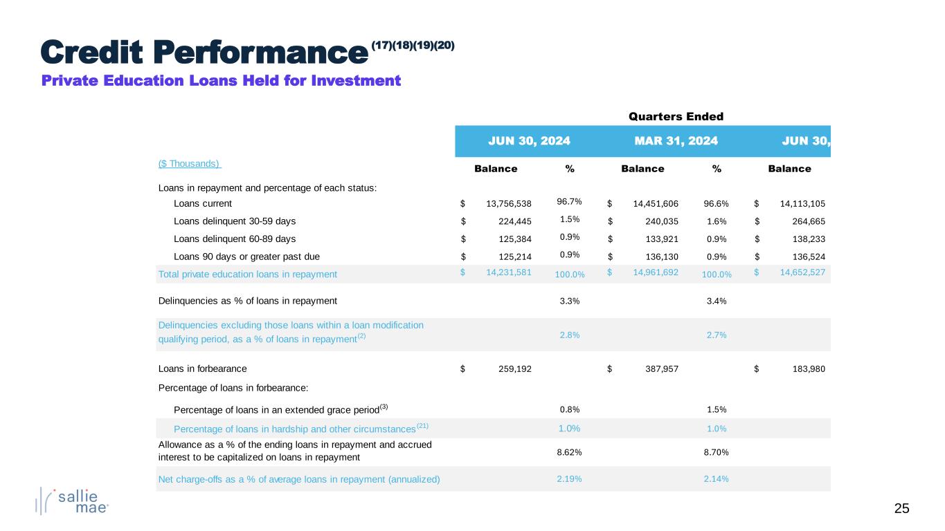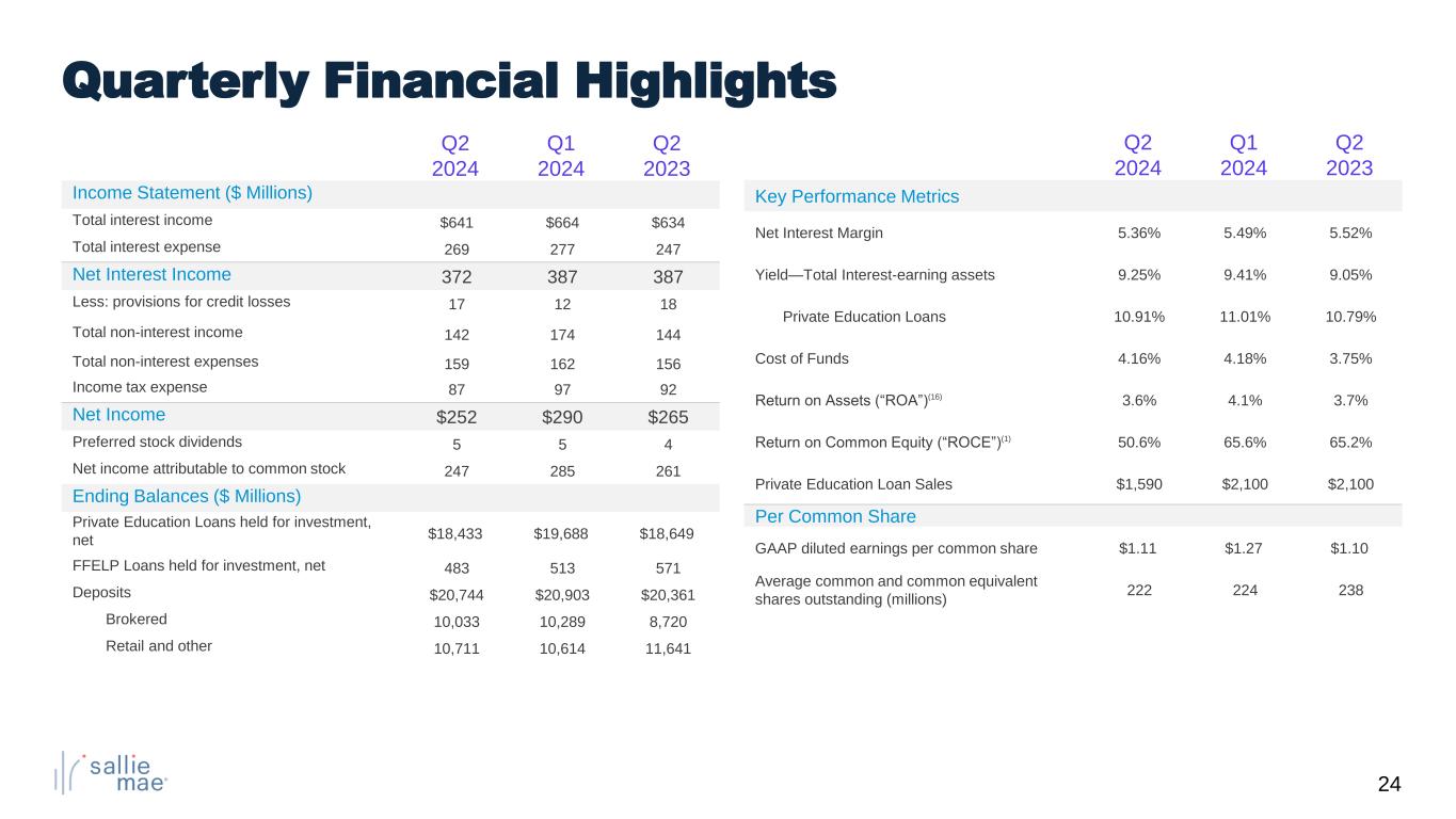 24 Q2 2024 Q1 2024 Q2 2023 Income Statement ($ Millions) Total interest income $641 $664 $634 Total interest expense 269 277 247 Net Interest Income 372 387 387 Less: provisions for credit losses 17 12 18 Total non-interest income 142 174 144 Total non-interest expenses 159 162 156 Income tax expense 87 97 92 Net Income $252 $290 $265 Preferred stock dividends 5 5 4 Net income attributable to common stock 247 285 261 Ending Balances ($ Millions) Private Education Loans held for investment, net $18,433 $19,688 $18,649 FFELP Loans held for investment, net 483 513 571 Deposits $20,744 $20,903 $20,361 Brokered 10,033 10,289 8,720 Retail and other 10,711 10,614 11,641 Q2 2024 Q1 2024 Q2 2023 Key Performance Metrics Net Interest Margin 5.36% 5.49% 5.52% Yield—Total Interest-earning assets 9.25% 9.41% 9.05% Private Education Loans 10.91% 11.01% 10.79% Cost of Funds 4.16% 4.18% 3.75% Return on Assets (“ROA”)(16) 3.6% 4.1% 3.7% Return on Common Equity (“ROCE”)(1) 50.6% 65.6% 65.2% Private Education Loan Sales $1,590 $2,100 $2,100 Per Common Share GAAP diluted earnings per common share $1.11 $1.27 $1.10 Average common and common equivalent shares outstanding (millions) 222 224 238 Quarterly Financial Highlights