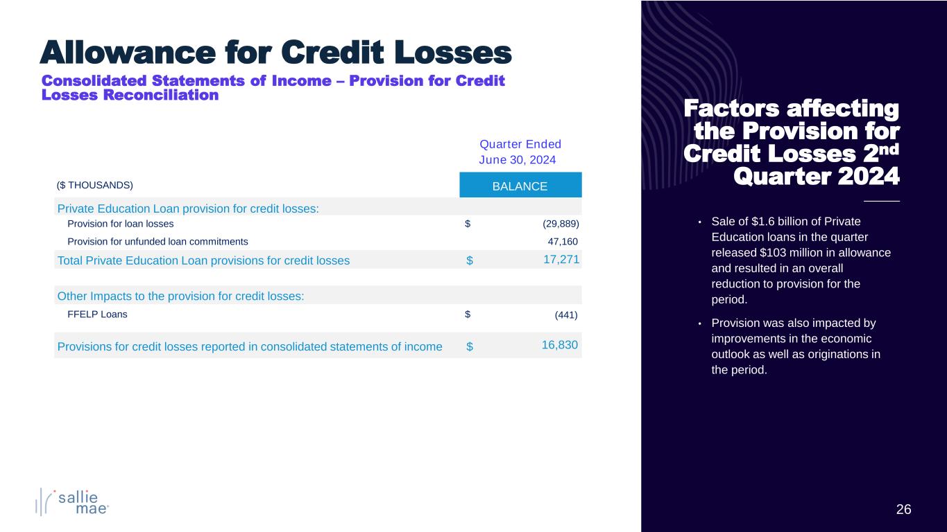 25 Credit Performance (17)(18)(19)(20) Private Education Loans Held for Investment ($ Thousands) Balance % Balance % Balance Loans in repayment and percentage of each status: Loans current 13,756,538$ 96.7% 14,451,606$ 96.6% 14,113,105$ Loans delinquent 30-59 days 224,445$ 1.5% 240,035$ 1.6% 264,665$ Loans delinquent 60-89 days 125,384$ 0.9% 133,921$ 0.9% 138,233$ Loans 90 days or greater past due 125,214$ 0.9% 136,130$ 0.9% 136,524$ Total private education loans in repayment 14,231,581$ 100.0% 14,961,692$ 100.0% 14,652,527$ Delinquencies as % of loans in repayment 3.3% 3.4% 2.8% 2.7% Loans in forbearance 259,192$ 387,957$ 183,980$ Percentage of loans in forbearance: Percentage of loans in an extended grace period(3) 0.8% 1.5% Percentage of loans in hardship and other circumstances (21) 1.0% 1.0% 8.62% 8.70% Net charge-offs as a % of average loans in repayment (annualized) 2.19% 2.14% JUN 30, 2023 Quarters Ended Delinquencies excluding those loans within a loan modification qualifying period, as a % of loans in repayment (2) Allowance as a % of the ending loans in repayment and accrued interest to be capitalized on loans in repayment JUN 30, 2024 MAR 31, 2024