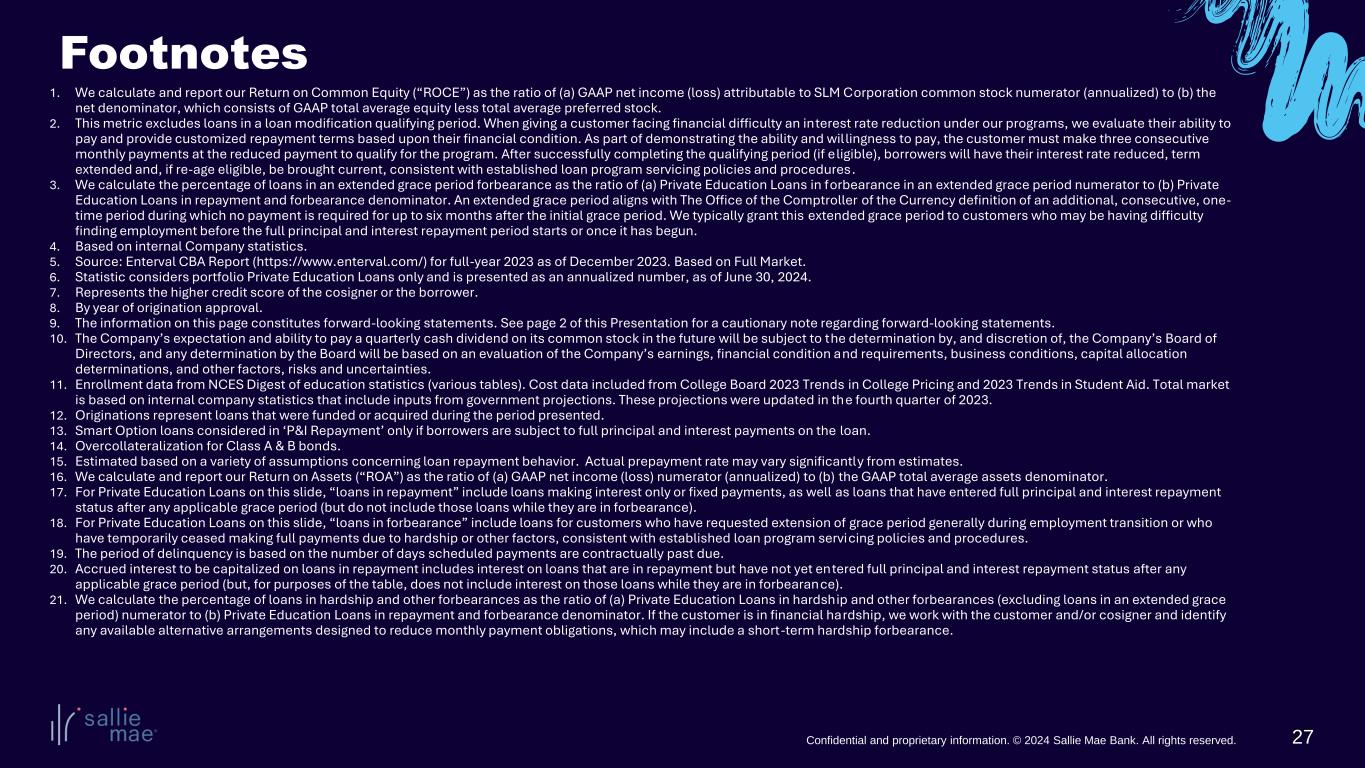 27Confidential and proprietary information. © 2024 Sallie Mae Bank. All rights reserved. 1. We calculate and report our Return on Common Equity (“ROCE”) as the ratio of (a) GAAP net income (loss) attributable to SLM Corporation common stock numerator (annualized) to (b) the net denominator, which consists of GAAP total average equity less total average preferred stock. 2. This metric excludes loans in a loan modification qualifying period. When giving a customer facing financial difficulty an interest rate reduction under our programs, we evaluate their ability to pay and provide customized repayment terms based upon their financial condition. As part of demonstrating the ability and willingness to pay, the customer must make three consecutive monthly payments at the reduced payment to qualify for the program. After successfully completing the qualifying period (if eligible), borrowers will have their interest rate reduced, term extended and, if re-age eligible, be brought current, consistent with established loan program servicing policies and procedures. 3. We calculate the percentage of loans in an extended grace period forbearance as the ratio of (a) Private Education Loans in forbearance in an extended grace period numerator to (b) Private Education Loans in repayment and forbearance denominator. An extended grace period aligns with The Office of the Comptroller of the Currency definition of an additional, consecutive, one- time period during which no payment is required for up to six months after the initial grace period. We typically grant this extended grace period to customers who may be having difficulty finding employment before the full principal and interest repayment period starts or once it has begun. 4. Based on internal Company statistics. 5. Source: Enterval CBA Report (https://www.enterval.com/) for full-year 2023 as of December 2023. Based on Full Market. 6. Statistic considers portfolio Private Education Loans only and is presented as an annualized number, as of June 30, 2024. 7. Represents the higher credit score of the cosigner or the borrower. 8. By year of origination approval. 9. The information on this page constitutes forward-looking statements. See page 2 of this Presentation for a cautionary note regarding forward-looking statements. 10. The Company’s expectation and ability to pay a quarterly cash dividend on its common stock in the future will be subject to the determination by, and discretion of, the Company’s Board of Directors, and any determination by the Board will be based on an evaluation of the Company’s earnings, financial condition and requirements, business conditions, capital allocation determinations, and other factors, risks and uncertainties. 11. Enrollment data from NCES Digest of education statistics (various tables). Cost data included from College Board 2023 Trends in College Pricing and 2023 Trends in Student Aid. Total market is based on internal company statistics that include inputs from government projections. These projections were updated in the fourth quarter of 2023. 12. Originations represent loans that were funded or acquired during the period presented. 13. Smart Option loans considered in ‘P&I Repayment’ only if borrowers are subject to full principal and interest payments on the loan. 14. Overcollateralization for Class A & B bonds. 15. Estimated based on a variety of assumptions concerning loan repayment behavior. Actual prepayment rate may vary significantly from estimates. 16. We calculate and report our Return on Assets (“ROA”) as the ratio of (a) GAAP net income (loss) numerator (annualized) to (b) the GAAP total average assets denominator. 17. For Private Education Loans on this slide, “loans in repayment” include loans making interest only or fixed payments, as well as loans that have entered full principal and interest repayment status after any applicable grace period (but do not include those loans while they are in forbearance). 18. For Private Education Loans on this slide, “loans in forbearance” include loans for customers who have requested extension of grace period generally during employment transition or who have temporarily ceased making full payments due to hardship or other factors, consistent with established loan program servicing policies and procedures. 19. The period of delinquency is based on the number of days scheduled payments are contractually past due. 20. Accrued interest to be capitalized on loans in repayment includes interest on loans that are in repayment but have not yet entered full principal and interest repayment status after any applicable grace period (but, for purposes of the table, does not include interest on those loans while they are in forbearance). 21. We calculate the percentage of loans in hardship and other forbearances as the ratio of (a) Private Education Loans in hardship and other forbearances (excluding loans in an extended grace period) numerator to (b) Private Education Loans in repayment and forbearance denominator. If the customer is in financial hardship, we work with the customer and/or cosigner and identify any available alternative arrangements designed to reduce monthly payment obligations, which may include a short-term hardship forbearance. Footnotes
