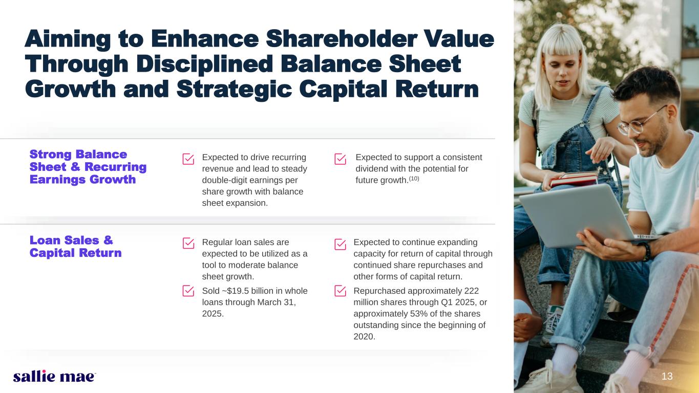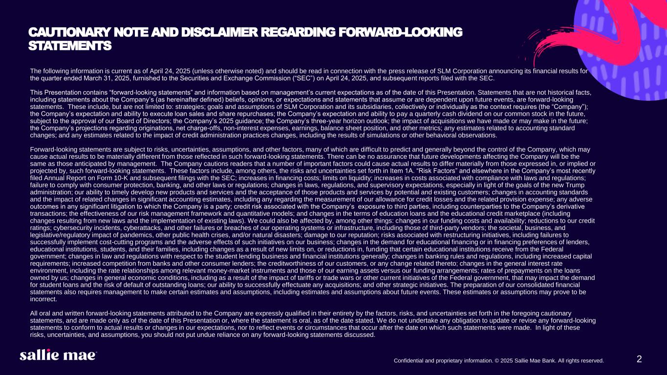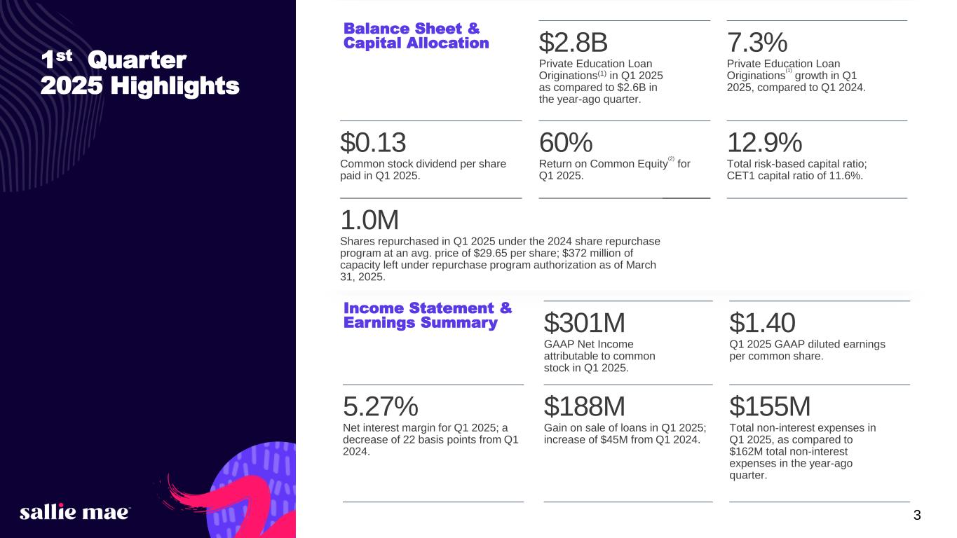 2Confidential and proprietary information. © 2025 Sallie Mae Bank. All rights reserved. The following information is current as of April 24, 2025 (unless otherwise noted) and should be read in connection with the press release of SLM Corporation announcing its financial results for the quarter ended March 31, 2025, furnished to the Securities and Exchange Commission (“SEC”) on April 24, 2025, and subsequent reports filed with the SEC. This Presentation contains “forward-looking statements” and information based on management’s current expectations as of the date of this Presentation. Statements that are not historical facts, including statements about the Company’s (as hereinafter defined) beliefs, opinions, or expectations and statements that assume or are dependent upon future events, are forward-looking statements. These include, but are not limited to: strategies; goals and assumptions of SLM Corporation and its subsidiaries, collectively or individually as the context requires (the “Company”); the Company’s expectation and ability to execute loan sales and share repurchases; the Company’s expectation and ability to pay a quarterly cash dividend on our common stock in the future, subject to the approval of our Board of Directors; the Company’s 2025 guidance; the Company’s three-year horizon outlook; the impact of acquisitions we have made or may make in the future; the Company’s projections regarding originations, net charge-offs, non-interest expenses, earnings, balance sheet position, and other metrics; any estimates related to accounting standard changes; and any estimates related to the impact of credit administration practices changes, including the results of simulations or other behavioral observations. Forward-looking statements are subject to risks, uncertainties, assumptions, and other factors, many of which are difficult to predict and generally beyond the control of the Company, which may cause actual results to be materially different from those reflected in such forward-looking statements. There can be no assurance that future developments affecting the Company will be the same as those anticipated by management. The Company cautions readers that a number of important factors could cause actual results to differ materially from those expressed in, or implied or projected by, such forward-looking statements. These factors include, among others, the risks and uncertainties set forth in Item 1A. “Risk Factors” and elsewhere in the Company’s most recently filed Annual Report on Form 10-K and subsequent filings with the SEC; increases in financing costs; limits on liquidity; increases in costs associated with compliance with laws and regulations; failure to comply with consumer protection, banking, and other laws or regulations; changes in laws, regulations, and supervisory expectations, especially in light of the goals of the new Trump administration; our ability to timely develop new products and services and the acceptance of those products and services by potential and existing customers; changes in accounting standards and the impact of related changes in significant accounting estimates, including any regarding the measurement of our allowance for credit losses and the related provision expense; any adverse outcomes in any significant litigation to which the Company is a party; credit risk associated with the Company’s exposure to third parties, including counterparties to the Company’s derivative transactions; the effectiveness of our risk management framework and quantitative models; and changes in the terms of education loans and the educational credit marketplace (including changes resulting from new laws and the implementation of existing laws). We could also be affected by, among other things: changes in our funding costs and availability; reductions to our credit ratings; cybersecurity incidents, cyberattacks, and other failures or breaches of our operating systems or infrastructure, including those of third-party vendors; the societal, business, and legislative/regulatory impact of pandemics, other public health crises, and/or natural disasters; damage to our reputation; risks associated with restructuring initiatives, including failures to successfully implement cost-cutting programs and the adverse effects of such initiatives on our business; changes in the demand for educational financing or in financing preferences of lenders, educational institutions, students, and their families, including changes as a result of new limits on, or reductions in, funding that certain educational institutions receive from the Federal government; changes in law and regulations with respect to the student lending business and financial institutions generally; changes in banking rules and regulations, including increased capital requirements; increased competition from banks and other consumer lenders; the creditworthiness of our customers, or any change related thereto; changes in the general interest rate environment, including the rate relationships among relevant money-market instruments and those of our earning assets versus our funding arrangements; rates of prepayments on the loans owned by us; changes in general economic conditions, including as a result of the impact of tariffs or trade wars or other current initiatives of the Federal government, that may impact the demand for student loans and the risk of default of outstanding loans; our ability to successfully effectuate any acquisitions; and other strategic initiatives. The preparation of our consolidated financial statements also requires management to make certain estimates and assumptions, including estimates and assumptions about future events. These estimates or assumptions may prove to be incorrect. All oral and written forward-looking statements attributed to the Company are expressly qualified in their entirety by the factors, risks, and uncertainties set forth in the fo