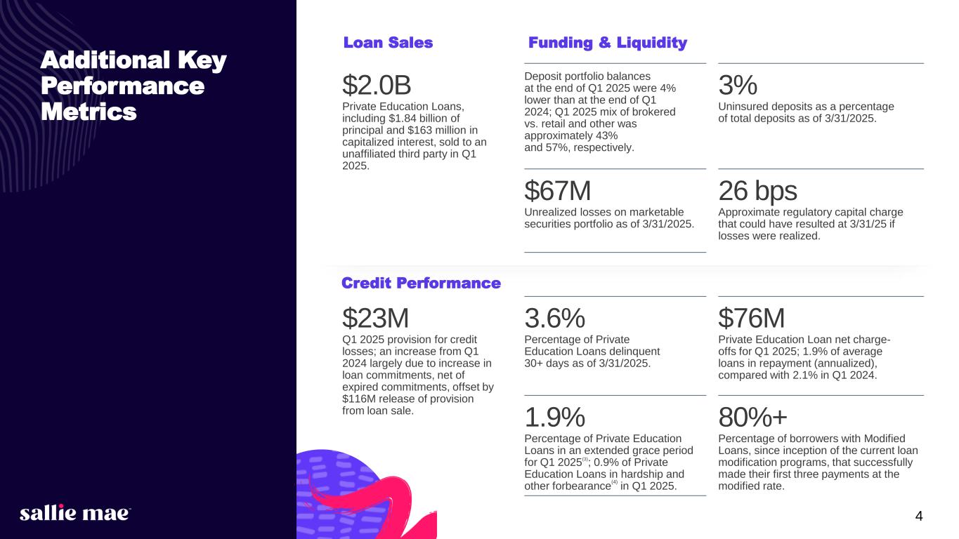 3 $301M GAAP Net Income attributable to common stock in Q1 2025. $1.40 Q1 2025 GAAP diluted earnings per common share. 5.27% Net interest margin for Q1 2025; a decrease of 22 basis points from Q1 2024. $188M Gain on sale of loans in Q1 2025; increase of $45M from Q1 2024. $155M Total non-interest expenses in Q1 2025, as compared to $162M total non-interest expenses in the year-ago quarter. 1st Quarter 2025 Highlights $2.8B Private Education Loan Originations(1) in Q1 2025 as compared to $2.6B in the year-ago quarter. 7.3% Private Education Loan Originations (1) growth in Q1 2025, compared to Q1 2024. $0.13 Common stock dividend per share paid in Q1 2025. 60% Return on Common Equity (2) for Q1 2025. 12.9% Total risk-based capital ratio; CET1 capital ratio of 11.6%. 1.0M Shares repurchased in Q1 2025 under the 2024 share repurchase program at an avg. price of $29.65 per share; $372 million of capacity left under repurchase program authorization as of March 31, 2025. Balance Sheet & Capital Allocation Income Statement & Earnings Summary