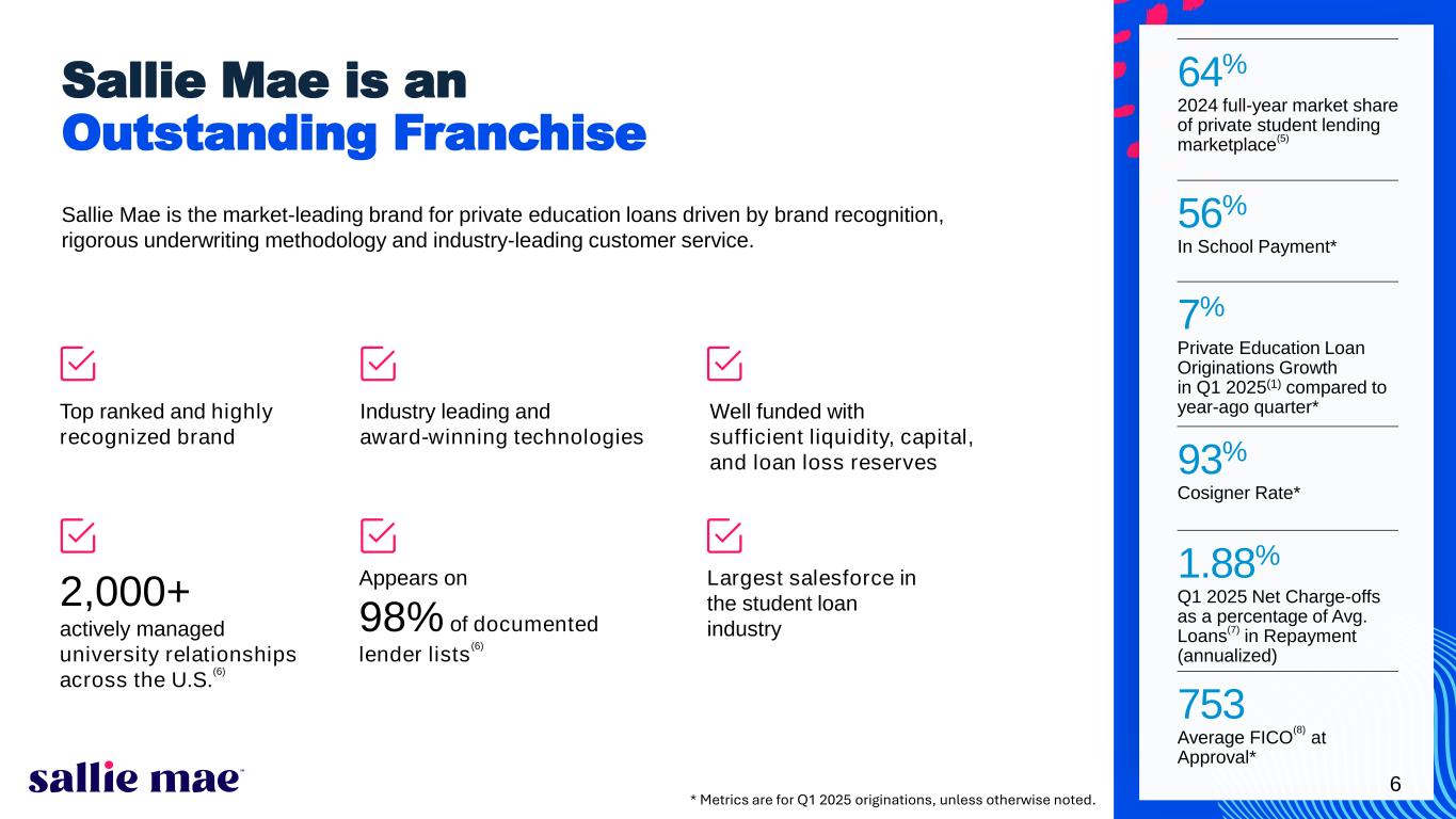 5 Outstanding financial track record with strong EPS performance and ROCE Well-positioned in large and growing private student loan market, with powerful brand recognition and attractive client base Consistent profitability, balance sheet strength and strong risk and compliance functions to mitigate enterprise-wide risk and support resiliency of results Rigorous and consistent capital allocation and return program in place to enhance shareholder value A Compelling Investment Opportunity Significant potential for profitable growth and shareholder returns