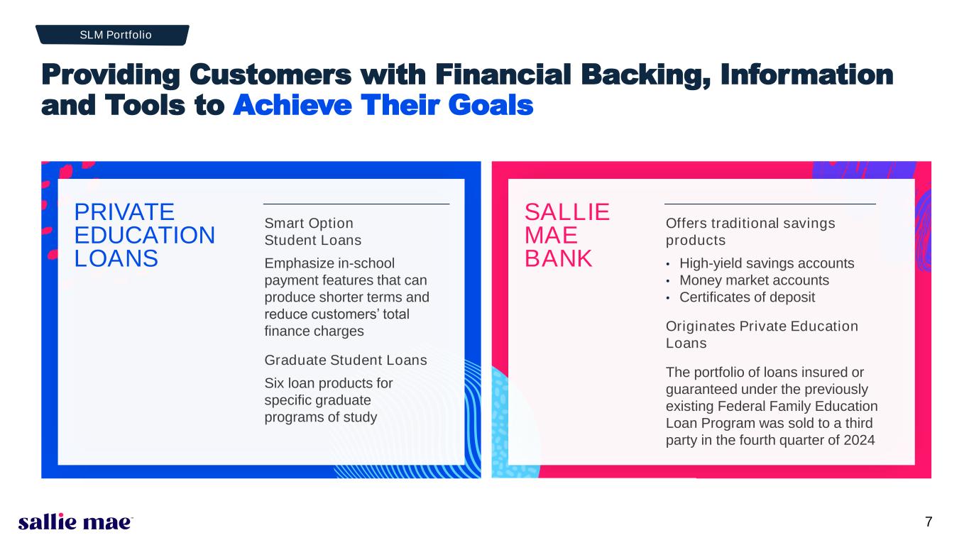 6 64% 2024 full-year market share of private student lending marketplace (5) 56% In School Payment* 7% Private Education Loan Originations Growth in Q1 2025(1) compared to year-ago quarter* 93% Cosigner Rate* 1.88% Q1 2025 Net Charge-offs as a percentage of Avg. Loans (7) in Repayment (annualized) 753 Average FICO (8) at Approval* Top ranked and highly recognized brand Industry leading and award-winning technologies Well funded with sufficient liquidity, capital, and loan loss reserves Sallie Mae is the market-leading brand for private education loans driven by brand recognition, rigorous underwriting methodology and industry-leading customer service. 2,000+ actively managed university relationships across the U.S. (6) Appears on 98% of documented lender lists (6) Largest salesforce in the student loan industry Sallie Mae is an Outstanding Franchise * Metrics are for Q1 2025 originations, unless otherwise noted.