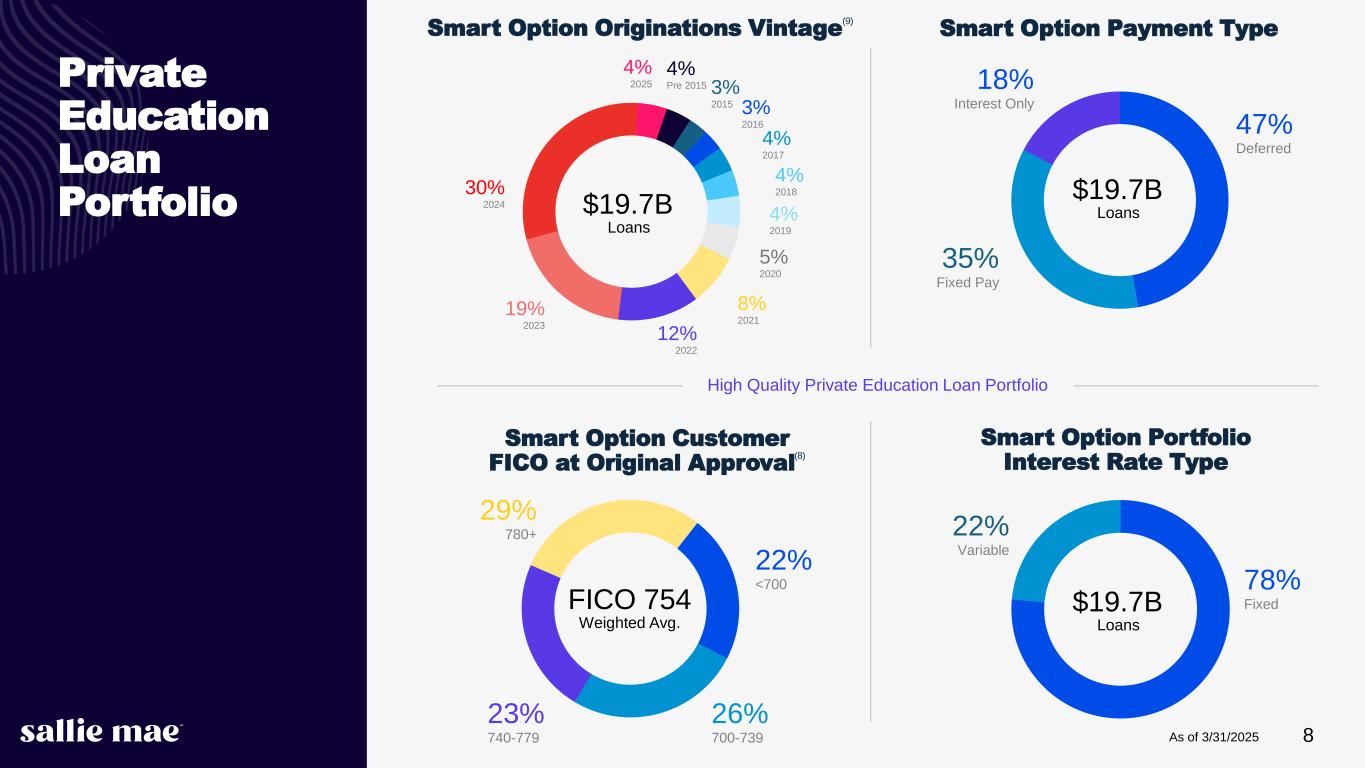 7 Providing Customers with Financial Backing, Information and Tools to Achieve Their Goals SALLIE MAE BANK Offers traditional savings products • High-yield savings accounts • Money market accounts • Certificates of deposit Originates Private Education Loans The portfolio of loans insured or guaranteed under the previously existing Federal Family Education Loan Program was sold to a third party in the fourth quarter of 2024 PRIVATE EDUCATION LOANS Smart Option Student Loans Emphasize in-school payment features that can produce shorter terms and reduce customers’ total finance charges Graduate Student Loans Six loan products for specific graduate programs of study SLM Portfolio