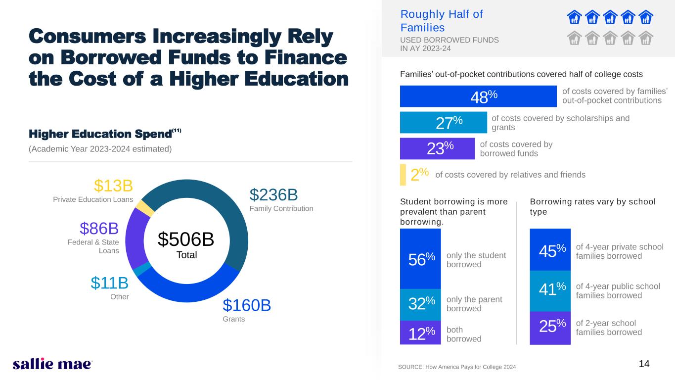 14 Consumers Increasingly Rely on Borrowed Funds to Finance the Cost of a Higher Education Roughly Half of Families Student borrowing is more prevalent than parent borrowing. Borrowing rates vary by school type USED BORROWED FUNDS IN AY 2023-24 SOURCE: How America Pays for College 2024 Families’ out-of-pocket contributions covered half of college costs $236B Family Contribution $160B Grants $11B Other $13B Private Education Loans Higher Education Spend (11) (Academic Year 2023-2024 estimated) $86B Federal & State Loans $506B Total 56% only the student borrowed 32% only the parent borrowed 12% both borrowed 45% of 4-year private school families borrowed 41% of 4-year public school families borrowed 25% of 2-year school families borrowed of costs covered by families’ out-of-pocket contributions of costs covered by scholarships and grants of costs covered by borrowed funds of costs covered by relatives and friends 48% 27% 23% 2%