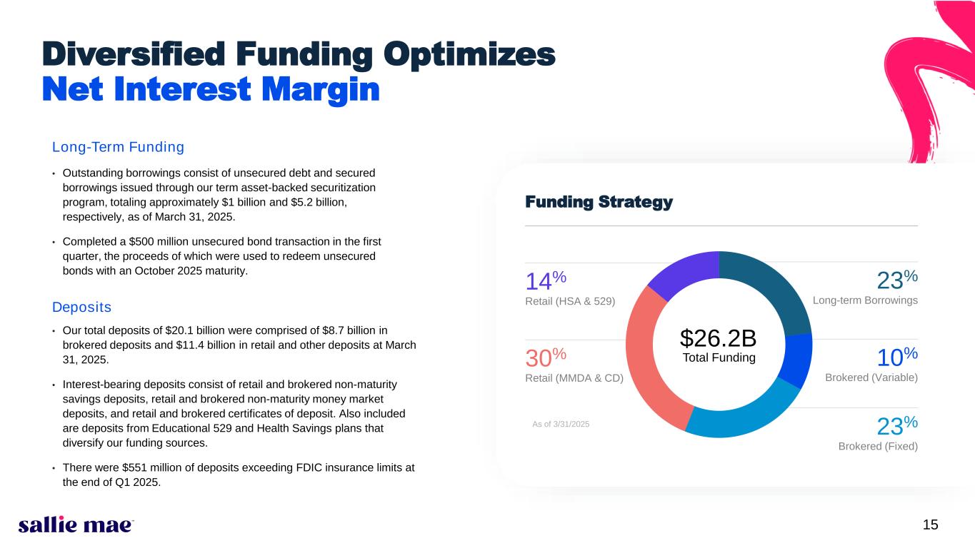 4 $23M Q1 2025 provision for credit losses; an increase from Q1 2024 largely due to increase in loan commitments, net of expired commitments, offset by $116M release of provision from loan sale. 3.6% Percentage of Private Education Loans delinquent 30+ days as of 3/31/2025. $76M Private Education Loan net charge- offs for Q1 2025; 1.9% of average loans in repayment (annualized), compared with 2.1% in Q1 2024. 1.9% Percentage of Private Education Loans in an extended grace period for Q1 2025 (3) ; 0.9% of Private Education Loans in hardship and other forbearance (4) in Q1 2025. 80%+ Percentage of borrowers with Modified Loans, since inception of the current loan modification programs, that successfully made their first three payments at the modified rate. Additional Key Performance Metrics Credit Performance Funding & LiquidityLoan Sales $2.0B Private Education Loans, including $1.84 billion of principal and $163 million in capitalized interest, sold to an unaffiliated third party in Q1 2025. Deposit portfolio balances at the end of Q1 2025 were 4% lower than at the end of Q1 2024; Q1 2025 mix of brokered vs. retail and other was approximately 43% and 57%, respectively. 3% Uninsured deposits as a percentage of total deposits as of 3/31/2025. $67M Unrealized losses on marketable securities portfolio as of 3/31/2025. 26 bps Approximate regulatory capital charge that could have resulted at 3/31/25 if losses were realized.