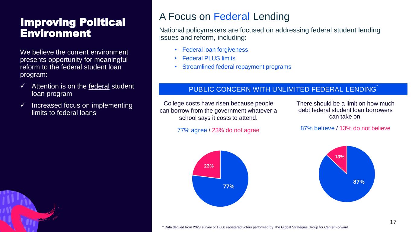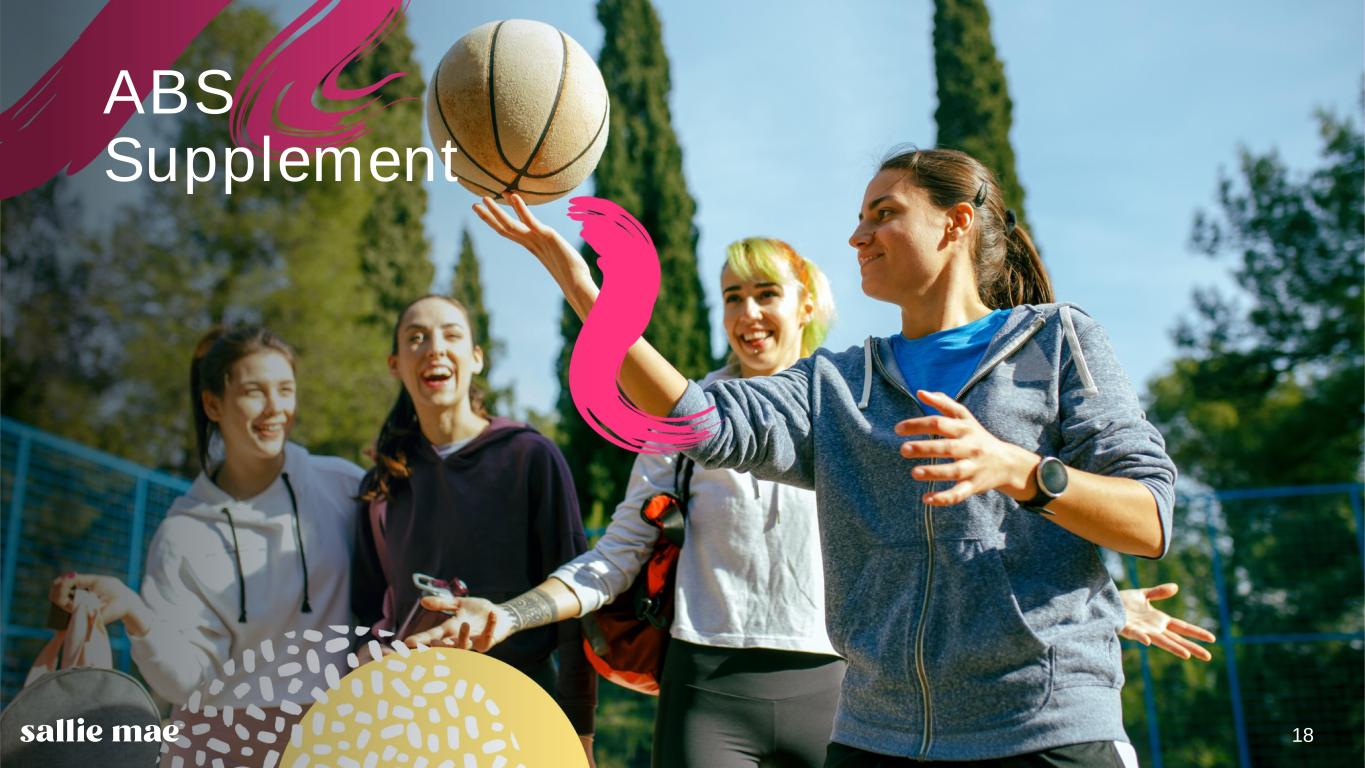 16 Confidential and proprietary information. © 2025 Sallie Mae Bank. All rights reserved. $5,423 $5,975 $6,383 $7,013 2021 2022 2023 2024 2025 87%748 56% 86%747 57% 86%750 59% Private Education Loan Trends First quarter 2025 originations at approximately $2.77 billion, 7% higher than the year-ago quarter. Cosigned rate for applications was up 1.4% from the year-ago quarter, in addition to Application FICOs increasing 2 points from the year- ago quarter. Average FICO at Approval(8) In School Payment Cosigned Private Education Loan Originations(1) + 7% + 10% 753 Average FICO at Approval(8) 56% In School Payment 93% Cosigned Q1 2025 748 Average FICO at Approval(8) 55% In School Payment 91% Cosigned Q1 2024 + 10% * $2,771 Q1 Full Year 2025* $2,582 Q1 90%752 56% * The shaded block representing full year 2025 originations is a projected estimate. These estimates and related comments constitute forward-looking statements and are based on performance during the first three months of 2025 and management’s current expectations and beliefs. There can be no guarantee as to whether and to what extent these estimates will be achieved. The Company undertakes no obligation to revise or release any revision or update to these forward-looking statements. See our Forward-Looking Statements disclosures on pg. 2 for more information.