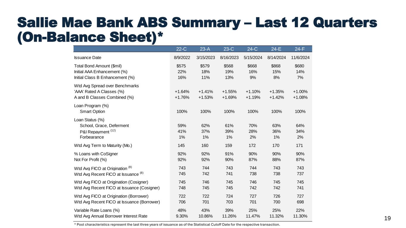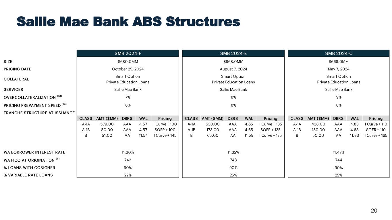 19 Sallie Mae Bank ABS Summary – Last 12 Quarters (On-Balance Sheet)* * Pool characteristics represent the last three years of issuance as of the Statistical Cutoff Date for the respective transaction. 22-C 23-A 23-C 24-C 24-E 24-F Issuance Date 8/9/2022 3/15/2023 8/16/2023 5/15/2024 8/14/2024 11/6/2024 Total Bond Amount ($mil) $575 $579 $568 $668 $868 $680 Initial AAA Enhancement (%) 22% 18% 19% 16% 15% 14% Initial Class B Enhancement (%) 16% 11% 13% 9% 8% 7% Wtd Avg Spread over Benchmarks 'AAA' Rated A Classes (%) +1.64% +1.41% +1.55% +1.10% +1.35% +1.00% A and B Classes Combined (%) +1.76% +1.53% +1.69% +1.19% +1.42% +1.08% Loan Program (%) Smart Option 100% 100% 100% 100% 100% 100% Loan Status (%) School, Grace, Deferment 59% 62% 61% 70% 63% 64% P&I Repayment (12) 41% 37% 39% 28% 36% 34% Forbearance 1% 1% 1% 2% 1% 2% Wtd Avg Term to Maturity (Mo.) 145 160 159 172 170 171 % Loans with CoSigner 92% 92% 91% 90% 90% 90% Not For Profit (%) 92% 92% 90% 87% 88% 87% Wtd Avg FICO at Origination (8) 743 744 743 744 743 743 Wtd Avg Recent FICO at Issuance (8) 745 742 741 738 738 737 Wtd Avg FICO at Origination (Cosigner) 745 746 745 746 745 745 Wtd Avg Recent FICO at Issuance (Cosigner) 748 745 745 742 742 741 Wtd Avg FICO at Origination (Borrower) 722 722 724 727 726 727 Wtd Avg Recent FICO at Issuance (Borrower) 706 701 703 701 700 698 Variable Rate Loans (%) 48% 43% 39% 25% 25% 22% Wtd Avg Annual Borrower Interest Rate 9.30% 10.86% 11.26% 11.47% 11.32% 11.30%
