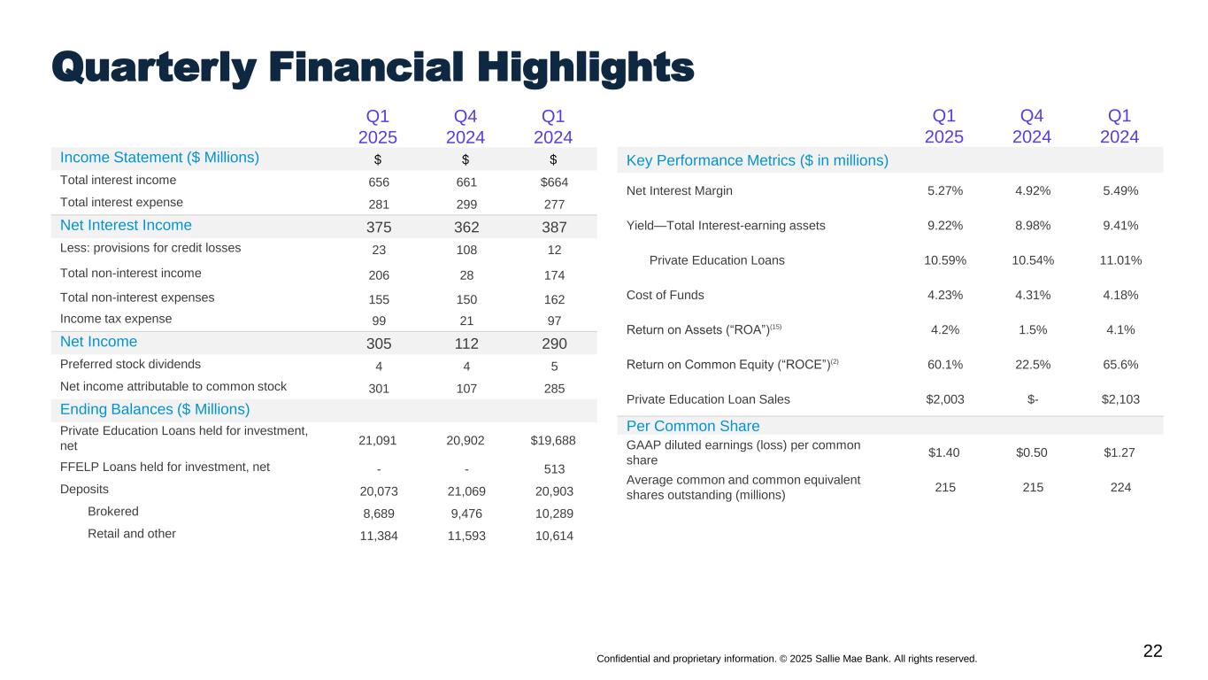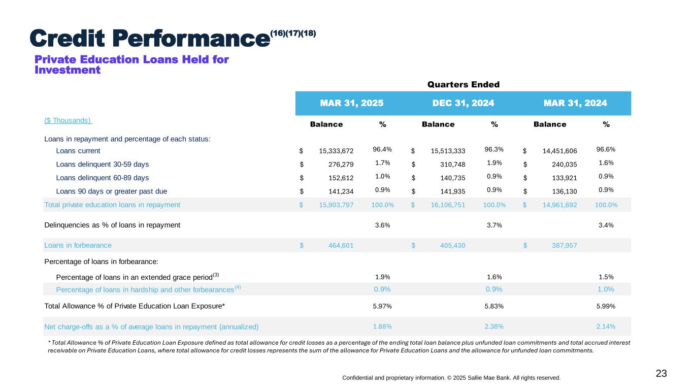 22 Confidential and proprietary information. © 2025 Sallie Mae Bank. All rights reserved. Q1 2025 Q4 2024 Q1 2024 Income Statement ($ Millions) Total interest income 656 661 $664 Total interest expense 281 299 277 Net Interest Income 375 362 387 Less: provisions for credit losses 23 108 12 Total non-interest income 206 28 174 Total non-interest expenses 155 150 162 Income tax expense 99 21 97 Net Income 305 112 290 Preferred stock dividends 4 4 5 Net income attributable to common stock 301 107 285 Ending Balances ($ Millions) Private Education Loans held for investment, net 21,091 20,902 $19,688 FFELP Loans held for investment, net - - 513 Deposits 20,073 21,069 20,903 Brokered 8,689 9,476 10,289 Retail and other 11,384 11,593 10,614 Q1 2025 Q4 2024 Q1 2024 Key Performance Metrics ($ in millions) Net Interest Margin 5.27% 4.92% 5.49% Yield—Total Interest-earning assets 9.22% 8.98% 9.41% Private Education Loans 10.59% 10.54% 11.01% Cost of Funds 4.23% 4.31% 4.18% Return on Assets (“ROA”)(15) 4.2% 1.5% 4.1% Return on Common Equity (“ROCE”)(2) 60.1% 22.5% 65.6% Private Education Loan Sales $2,003 $- $2,103 Per Common Share GAAP diluted earnings (loss) per common share $1.40 $0.50 $1.27 Average common and common equivalent shares outstanding (millions) 215 215 224 Quarterly Financial Highlights