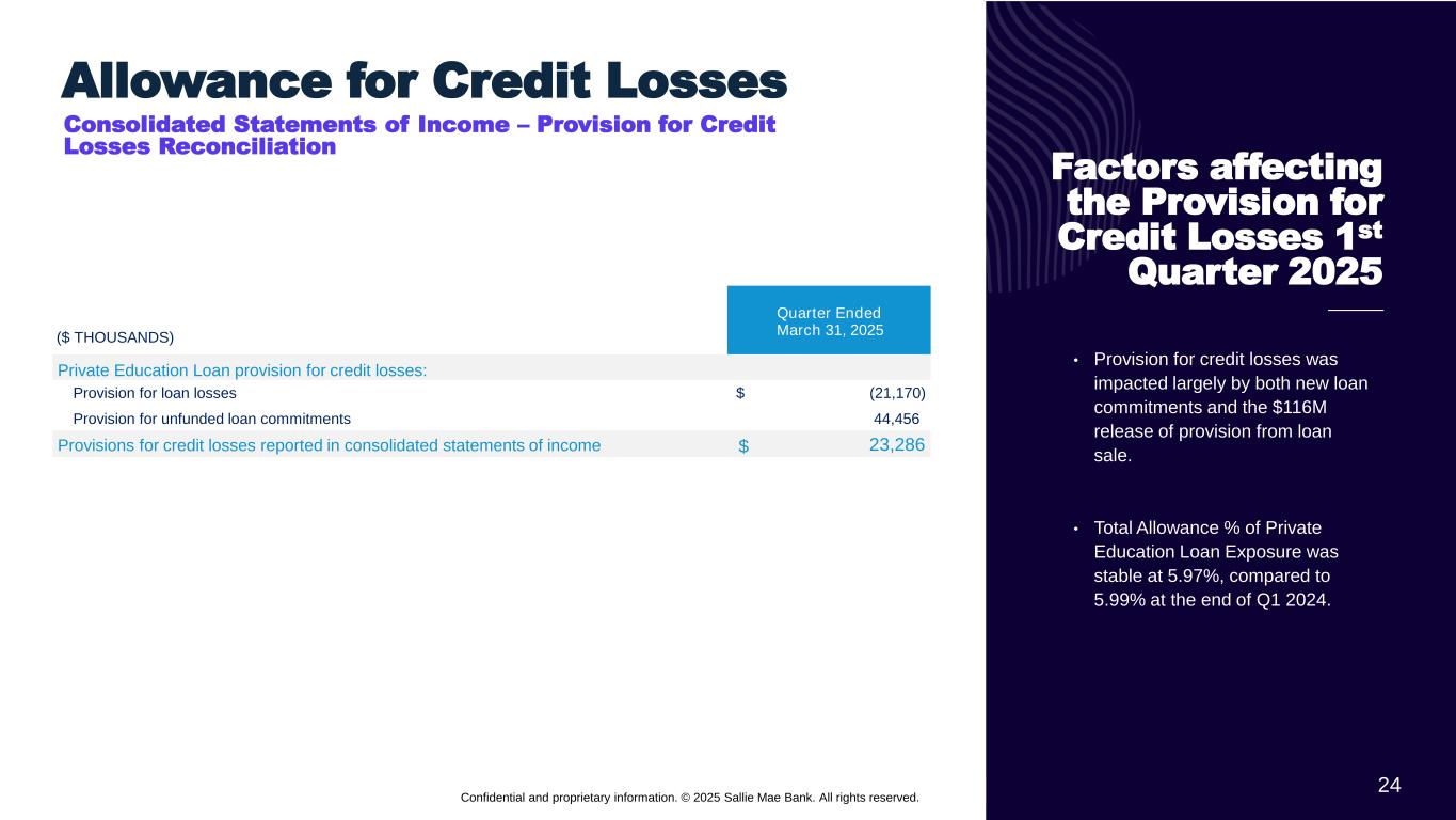 23 Confidential and proprietary information. © 2025 Sallie Mae Bank. All rights reserved. Credit Performance(16)(17)(18) Private Education Loans Held for Investment * Total Allowance % of Private Education Loan Exposure defined as total allowance for credit losses as a percentage of the ending total loan balance plus unfunded loan commitments and total accrued interest receivable on Private Education Loans, where total allowance for credit losses represents the sum of the allowance for Private Education Loans and the allowance for unfunded loan commitments. ($ Thousands) Balance % Balance % Balance % Loans in repayment and percentage of each status: Loans current 15,333,672$ 96.4% 15,513,333$ 96.3% 14,451,606$ 96.6% Loans delinquent 30-59 days 276,279$ 1.7% 310,748$ 1.9% 240,035$ 1.6% Loans delinquent 60-89 days 152,612$ 1.0% 140,735$ 0.9% 133,921$ 0.9% Loans 90 days or greater past due 141,234$ 0.9% 141,935$ 0.9% 136,130$ 0.9% Total private education loans in repayment 15,903,797$ 100.0% 16,106,751$ 100.0% 14,961,692$ 100.0% Delinquencies as % of loans in repayment 3.6% 3.7% 3.4% Loans in forbearance 464,601$ 405,430$ 387,957$ Percentage of loans in forbearance: Percentage of loans in an extended grace period(3) 1.9% 1.6% 1.5% Percentage of loans in hardship and other forbearances (4) 0.9% 0.9% 1.0% 5.97% 5.83% 5.99% Net charge-offs as a % of average loans in repayment (annualized) 1.88% 2.38% 2.14% Total Allowance % of Private Education Loan Exposure* MAR 31, 2024 Quarters Ended MAR 31, 2025 DEC 31, 2024