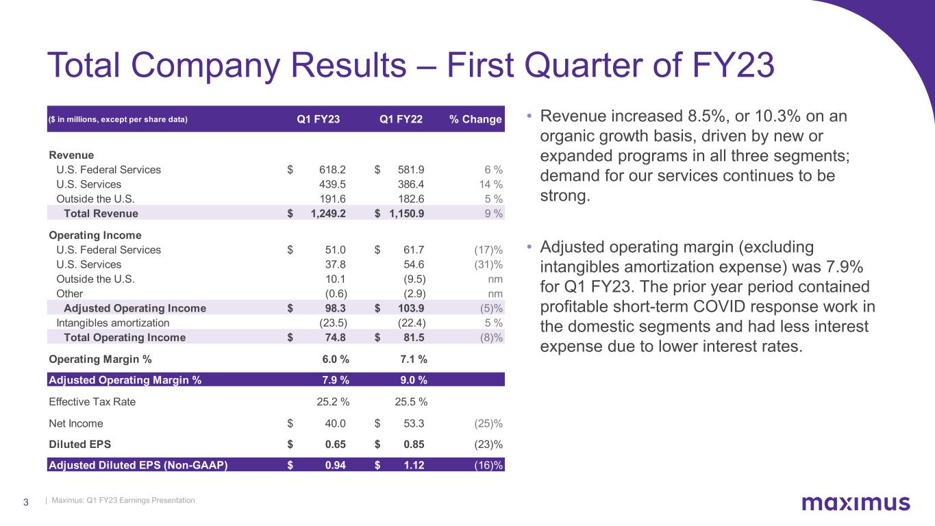 | Maximus: Q1 FY23 Earnings Presentation2 These slides should be read in conjunction with the Company’s most recent quarterly earnings press release, along with listening to or reading a transcript of the comments of Company management from our most recent quarterly earnings conference call. This document may contain non-GAAP financial information. Management uses this information in its internal analysis of results and believes that this information may be informative to investors in gauging the quality of our financial performance, identifying trends in our results, and providing meaningful period-to-period comparisons. These measures should be used in conjunction with, rather than instead of, their comparable GAAP measures. For a reconciliation of non-GAAP measures to the comparable GAAP measures presented in this document, see the Company’s most recent quarterly earnings press release. Included in this presentation are forward-looking statements within the meaning of the safe harbor provisions of the United States Private Securities Litigation Reform Act of 1995. Forward-looking statements can be identified by words such as: "anticipate," "intend," "plan," "goal," "seek," "opportunity," "could," "potential," "believe," "project," "estimate," "expect," "forecast," "strategy," "future," "likely," "may," "should," "will," and similar references to future periods. Forward-looking statements that are not historical facts, including statements about our confidence, strategies and initiatives and our expectations about revenues, results of operations, profitability, liquidity, market demand or the impact of the pandemic are forward-looking statements that involve risks and uncertainties such as those related to the impact of the pandemic and our recently-completed acquisitions. These risks could cause the Company’s actual results to differ materially from those indicated by such forward-looking statements. A summary of risk factors can be found in Item 1A, "Risk Factors" in our Annual Report on Form 10-K for the year ended September 30, 2022, which was filed with the Securities and Exchange Commission (SEC) on November 22, 2022. Any forward-looking statement made by us in this report is based only on information currently available to us and speaks only as of the date on which it is made. We undertake no obligation to publicly update any forward-looking statement, whether written or oral, that may be made from time to time, whether as a result of new information, future developments or otherwise. Throughout this presentation, numbers may not add due to rounding. Forward-looking Statements & Non-GAAP Information