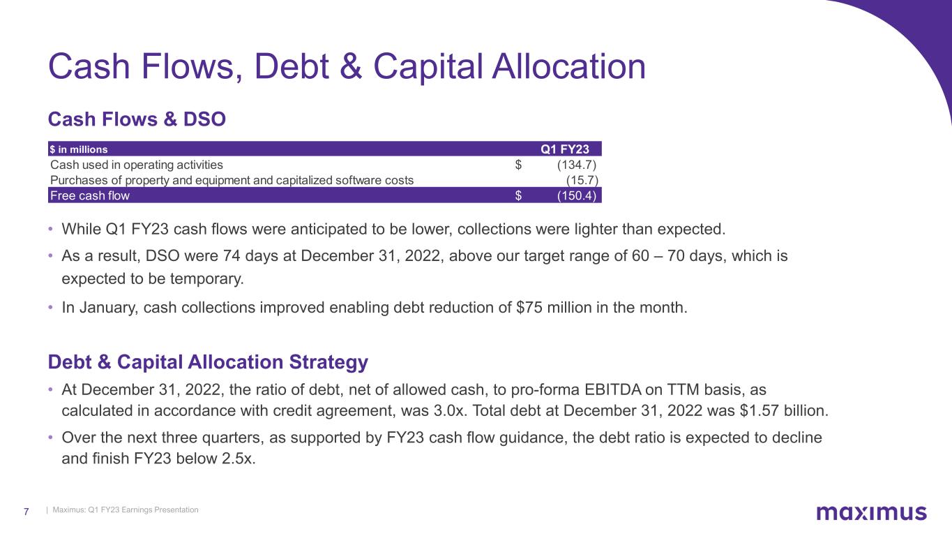 | Maximus: Q1 FY23 Earnings Presentation7 Cash Flows, Debt & Capital Allocation Cash Flows & DSO • While Q1 FY23 cash flows were anticipated to be lower, collections were lighter than expected. • As a result, DSO were 74 days at December 31, 2022, above our target range of 60 – 70 days, which is expected to be temporary. • In January, cash collections improved enabling debt reduction of $75 million in the month. Debt & Capital Allocation Strategy • At December 31, 2022, the ratio of debt, net of allowed cash, to pro-forma EBITDA on TTM basis, as calculated in accordance with credit agreement, was 3.0x. Total debt at December 31, 2022 was $1.57 billion. • Over the next three quarters, as supported by FY23 cash flow guidance, the debt ratio is expected to decline and finish FY23 below 2.5x. $ in millions Q1 FY23 Cash used in operating activities $ (134.7) Purchases of property and equipment and capitalized software costs (15.7) Free cash flow $ (150.4)