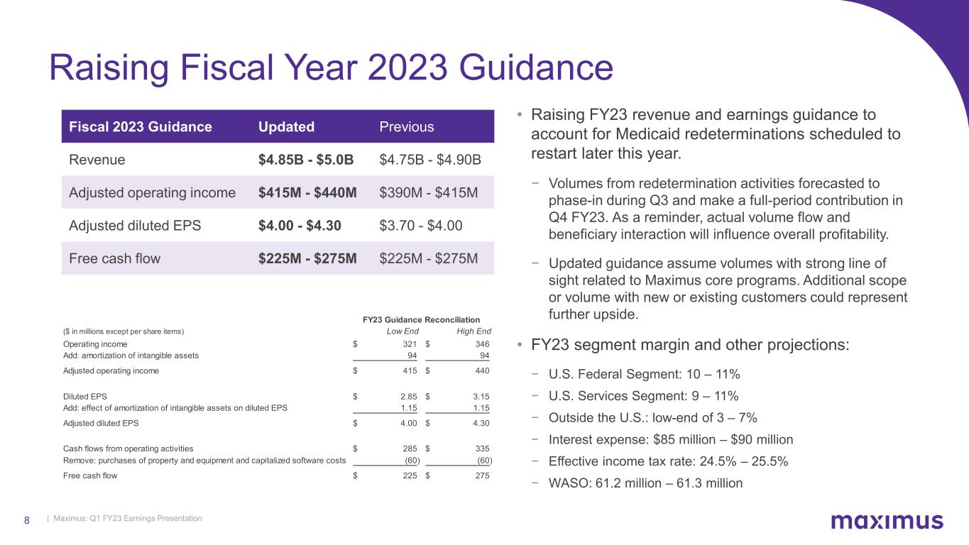 | Maximus: Q1 FY23 Earnings Presentation8 Raising Fiscal Year 2023 Guidance Fiscal 2023 Guidance Updated Previous Revenue $4.85B - $5.0B $4.75B - $4.90B Adjusted operating income $415M - $440M $390M - $415M Adjusted diluted EPS $4.00 - $4.30 $3.70 - $4.00 Free cash flow $225M - $275M $225M - $275M • Raising FY23 revenue and earnings guidance to account for Medicaid redeterminations scheduled to restart later this year. − Volumes from redetermination activities forecasted to phase-in during Q3 and make a full-period contribution in Q4 FY23. As a reminder, actual volume flow and beneficiary interaction will influence overall profitability. − Updated guidance assume volumes with strong line of sight related to Maximus core programs. Additional scope or volume with new or existing customers could represent further upside. • FY23 segment margin and other projections: − U.S. Federal Segment: 10 – 11% − U.S. Services Segment: 9 – 11% − Outside the U.S.: low-end of 3 – 7% − Interest expense: $85 million – $90 million − Effective income tax rate: 24.5% – 25.5% − WASO: 61.2 million – 61.3 million ($ in millions except per share items) Low End High End Operating income 321$ 346$ Add: amortization of intangible assets 94 94 Adjusted operating income 415$ 440$ Diluted EPS 2.85$ 3.15$ Add: effect of amortization of intangible assets on diluted EPS 1.15 1.15 Adjusted diluted EPS 4.00$ 4.30$ Cash flows from operating activities 285$ 335$ Remove: purchases of property and equipment and capitalized software costs (60) (60) Free cash flow 225$ 275$ FY23 Guidance Reconciliation
