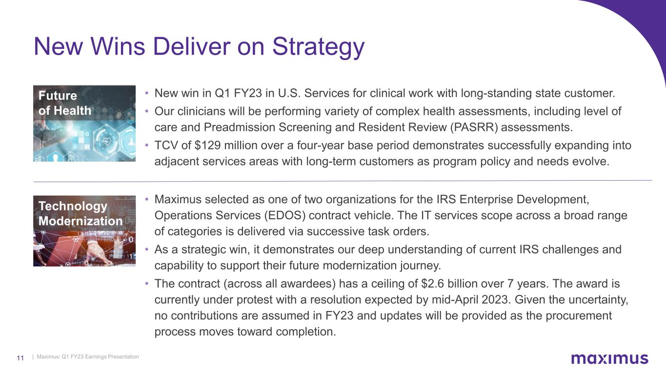 | Maximus: Q1 FY23 Earnings Presentation11 • New win in Q1 FY23 in U.S. Services for clinical work with long-standing state customer. • Our clinicians will be performing variety of complex health assessments, including level of care and Preadmission Screening and Resident Review (PASRR) assessments. • TCV of $129 million over a four-year base period demonstrates successfully expanding into adjacent services areas with long-term customers as program policy and needs evolve. • Maximus selected as one of two organizations for the IRS Enterprise Development, Operations Services (EDOS) contract vehicle. The IT services scope across a broad range of categories is delivered via successive task orders. • As a strategic win, it demonstrates our deep understanding of current IRS challenges and capability to support their future modernization journey. • The contract (across all awardees) has a ceiling of $2.6 billion over 7 years. The award is currently under protest with a resolution expected by mid-April 2023. Given the uncertainty, no contributions are assumed in FY23 and updates will be provided as the procurement process moves toward completion. New Wins Deliver on Strategy Future of Health Technology Modernization