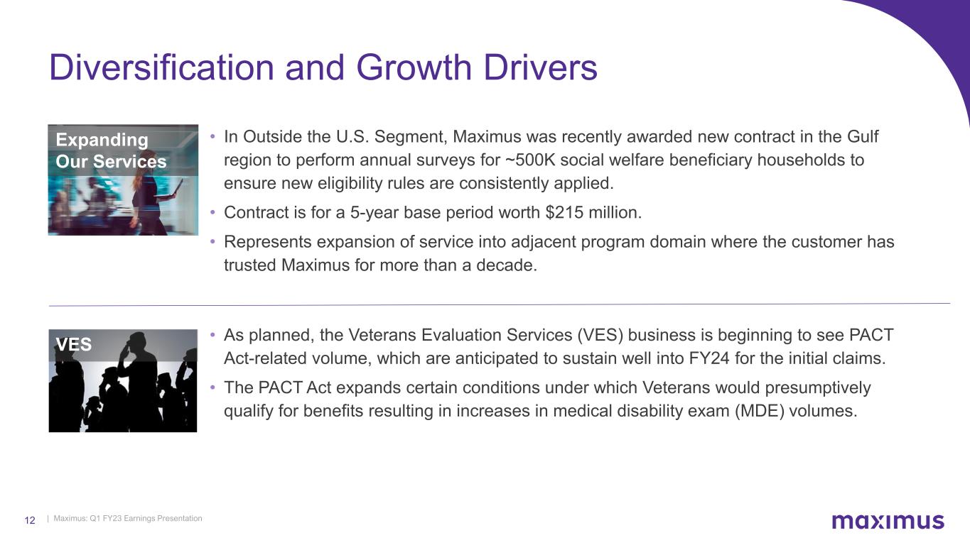 | Maximus: Q1 FY23 Earnings Presentation12 Diversification and Growth Drivers • In Outside the U.S. Segment, Maximus was recently awarded new contract in the Gulf region to perform annual surveys for ~500K social welfare beneficiary households to ensure new eligibility rules are consistently applied. • Contract is for a 5-year base period worth $215 million. • Represents expansion of service into adjacent program domain where the customer has trusted Maximus for more than a decade. • As planned, the Veterans Evaluation Services (VES) business is beginning to see PACT Act-related volume, which are anticipated to sustain well into FY24 for the initial claims. • The PACT Act expands certain conditions under which Veterans would presumptively qualify for benefits resulting in increases in medical disability exam (MDE) volumes. Expanding Our Services VES