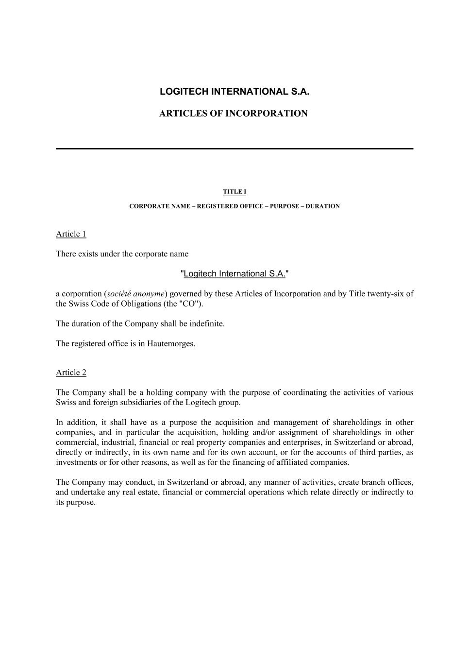 LOGITECH INTERNATIONAL S.A. ARTICLES OF INCORPORATION TITLE I CORPORATE NAME – REGISTERED OFFICE – PURPOSE – DURATION Article 1 There exists under the corporate name "Logitech International S.A." a corporation (société anonyme) governed by these Articles of Incorporation and by Title twenty-six of the Swiss Code of Obligations (the "CO"). The duration of the Company shall be indefinite. The registered office is in Hautemorges. Article 2 The Company shall be a holding company with the purpose of coordinating the activities of various Swiss and foreign subsidiaries of the Logitech group. In addition, it shall have as a purpose the acquisition and management of shareholdings in other companies, and in particular the acquisition, holding and/or assignment of shareholdings in other commercial, industrial, financial or real property companies and enterprises, in Switzerland or abroad, directly or indirectly, in its own name and for its own account, or for the accounts of third parties, as investments or for other reasons, as well as for the financing of affiliated companies. The Company may conduct, in Switzerland or abroad, any manner of activities, create branch offices, and undertake any real estate, financial or commercial operations which relate directly or indirectly to its purpose.