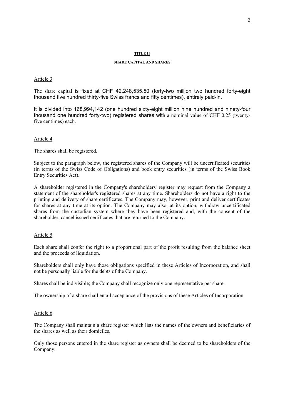 2 TITLE II SHARE CAPITAL AND SHARES Article 3 The share capital is fixed at CHF 42,248,535.50 (forty-two million two hundred forty-eight thousand five hundred thirty-five Swiss francs and fifty centimes), entirely paid-in. It is divided into 168,994,142 (one hundred sixty-eight million nine hundred and ninety-four thousand one hundred forty-two) registered shares with a nominal value of CHF 0.25 (twenty- five centimes) each. Article 4 The shares shall be registered. Subject to the paragraph below, the registered shares of the Company will be uncertificated securities (in terms of the Swiss Code of Obligations) and book entry securities (in terms of the Swiss Book Entry Securities Act). A shareholder registered in the Company's shareholders' register may request from the Company a statement of the shareholder's registered shares at any time. Shareholders do not have a right to the printing and delivery of share certificates. The Company may, however, print and deliver certificates for shares at any time at its option. The Company may also, at its option, withdraw uncertificated shares from the custodian system where they have been registered and, with the consent of the shareholder, cancel issued certificates that are returned to the Company. Article 5 Each share shall confer the right to a proportional part of the profit resulting from the balance sheet and the proceeds of liquidation. Shareholders shall only have those obligations specified in these Articles of Incorporation, and shall not be personally liable for the debts of the Company. Shares shall be indivisible; the Company shall recognize only one representative per share. The ownership of a share shall entail acceptance of the provisions of these Articles of Incorporation. Article 6 The Company shall maintain a share register which lists the names of the owners and beneficiaries of the shares as well as their domiciles. Only those persons entered in the share register as owners shall be deemed to be shareholders of the Company.