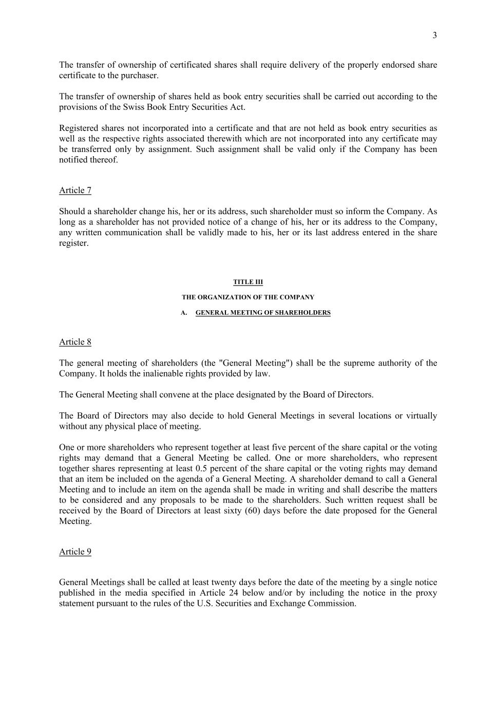 3 The transfer of ownership of certificated shares shall require delivery of the properly endorsed share certificate to the purchaser. The transfer of ownership of shares held as book entry securities shall be carried out according to the provisions of the Swiss Book Entry Securities Act. Registered shares not incorporated into a certificate and that are not held as book entry securities as well as the respective rights associated therewith which are not incorporated into any certificate may be transferred only by assignment. Such assignment shall be valid only if the Company has been notified thereof. Article 7 Should a shareholder change his, her or its address, such shareholder must so inform the Company. As long as a shareholder has not provided notice of a change of his, her or its address to the Company, any written communication shall be validly made to his, her or its last address entered in the share register. TITLE III THE ORGANIZATION OF THE COMPANY A. GENERAL MEETING OF SHAREHOLDERS Article 8 The general meeting of shareholders (the "General Meeting") shall be the supreme authority of the Company. It holds the inalienable rights provided by law. The General Meeting shall convene at the place designated by the Board of Directors. The Board of Directors may also decide to hold General Meetings in several locations or virtually without any physical place of meeting. One or more shareholders who represent together at least five percent of the share capital or the voting rights may demand that a General Meeting be called. One or more shareholders, who represent together shares representing at least 0.5 percent of the share capital or the voting rights may demand that an item be included on the agenda of a General Meeting. A shareholder demand to call a General Meeting and to include an item on the agenda shall be made in writing and shall describe the matters to be considered and any proposals to be made to the shareholders. Such written request shall be received by the Board of Directors at least sixty (60) days before the date proposed for the General Meeting. Article 9 General Meetings shall be called at least twenty days before the date of the meeting by a single notice published in the media specified in Article 24 below and/or by including the notice in the proxy statement pursuant to the rules of the U.S. Securities and Exchange Commission.