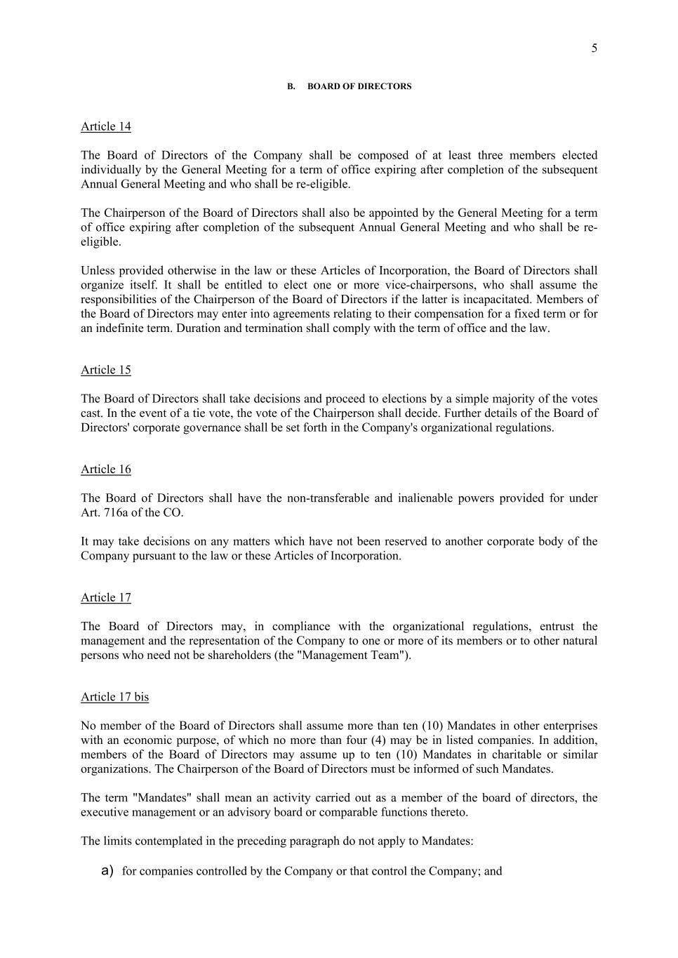 5 B. BOARD OF DIRECTORS Article 14 The Board of Directors of the Company shall be composed of at least three members elected individually by the General Meeting for a term of office expiring after completion of the subsequent Annual General Meeting and who shall be re-eligible. The Chairperson of the Board of Directors shall also be appointed by the General Meeting for a term of office expiring after completion of the subsequent Annual General Meeting and who shall be re- eligible. Unless provided otherwise in the law or these Articles of Incorporation, the Board of Directors shall organize itself. It shall be entitled to elect one or more vice-chairpersons, who shall assume the responsibilities of the Chairperson of the Board of Directors if the latter is incapacitated. Members of the Board of Directors may enter into agreements relating to their compensation for a fixed term or for an indefinite term. Duration and termination shall comply with the term of office and the law. Article 15 The Board of Directors shall take decisions and proceed to elections by a simple majority of the votes cast. In the event of a tie vote, the vote of the Chairperson shall decide. Further details of the Board of Directors' corporate governance shall be set forth in the Company's organizational regulations. Article 16 The Board of Directors shall have the non-transferable and inalienable powers provided for under Art. 716a of the CO. It may take decisions on any matters which have not been reserved to another corporate body of the Company pursuant to the law or these Articles of Incorporation. Article 17 The Board of Directors may, in compliance with the organizational regulations, entrust the management and the representation of the Company to one or more of its members or to other natural persons who need not be shareholders (the "Management Team"). Article 17 bis No member of the Board of Directors shall assume more than ten (10) Mandates in other enterprises with an economic purpose, of which no more than four (4) may be in listed companies. In addition, members of the Board of Directors may assume up to ten (10) Mandates in charitable or similar organizations. The Chairperson of the Board of Directors must be informed of such Mandates. The term "Mandates" shall mean an activity carried out as a member of the board of directors, the executive management or an advisory board or comparable functions thereto. The limits contemplated in the preceding paragraph do not apply to Mandates: a) for companies controlled by the Company or that control the Company; and