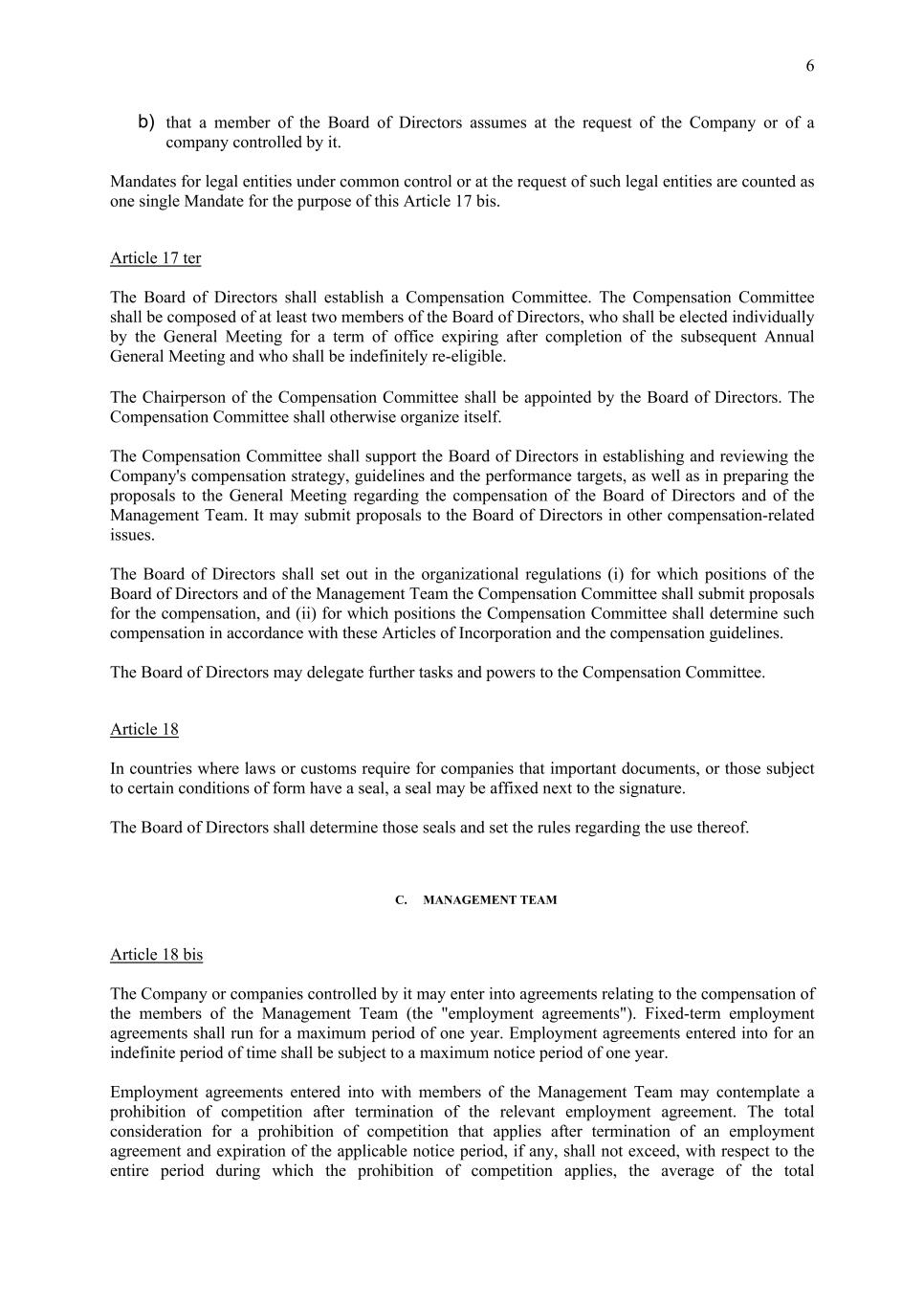 6 b) that a member of the Board of Directors assumes at the request of the Company or of a company controlled by it. Mandates for legal entities under common control or at the request of such legal entities are counted as one single Mandate for the purpose of this Article 17 bis. Article 17 ter The Board of Directors shall establish a Compensation Committee. The Compensation Committee shall be composed of at least two members of the Board of Directors, who shall be elected individually by the General Meeting for a term of office expiring after completion of the subsequent Annual General Meeting and who shall be indefinitely re-eligible. The Chairperson of the Compensation Committee shall be appointed by the Board of Directors. The Compensation Committee shall otherwise organize itself. The Compensation Committee shall support the Board of Directors in establishing and reviewing the Company's compensation strategy, guidelines and the performance targets, as well as in preparing the proposals to the General Meeting regarding the compensation of the Board of Directors and of the Management Team. It may submit proposals to the Board of Directors in other compensation-related issues. The Board of Directors shall set out in the organizational regulations (i) for which positions of the Board of Directors and of the Management Team the Compensation Committee shall submit proposals for the compensation, and (ii) for which positions the Compensation Committee shall determine such compensation in accordance with these Articles of Incorporation and the compensation guidelines. The Board of Directors may delegate further tasks and powers to the Compensation Committee. Article 18 In countries where laws or customs require for companies that important documents, or those subject to certain conditions of form have a seal, a seal may be affixed next to the signature. The Board of Directors shall determine those seals and set the rules regarding the use thereof. C. MANAGEMENT TEAM Article 18 bis The Company or companies controlled by it may enter into agreements relating to the compensation of the members of the Management Team (the "employment agreements"). Fixed-term employment agreements shall run for a maximum period of one year. Employment agreements entered into for an indefinite period of time shall be subject to a maximum notice period of one year. Employment agreements entered into with members of the Management Team may contemplate a prohibition of competition after termination of the relevant employment agreement. The total consideration for a prohibition of competition that applies after termination of an employment agreement and expiration of the applicable notice period, if any, shall not exceed, with respect to the entire period during which the prohibition of competition applies, the average of the total